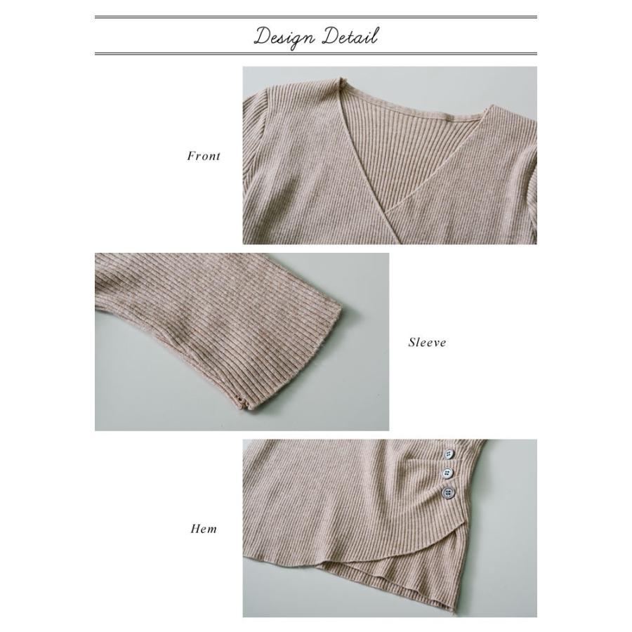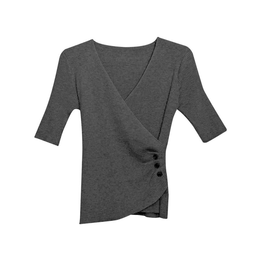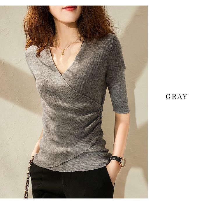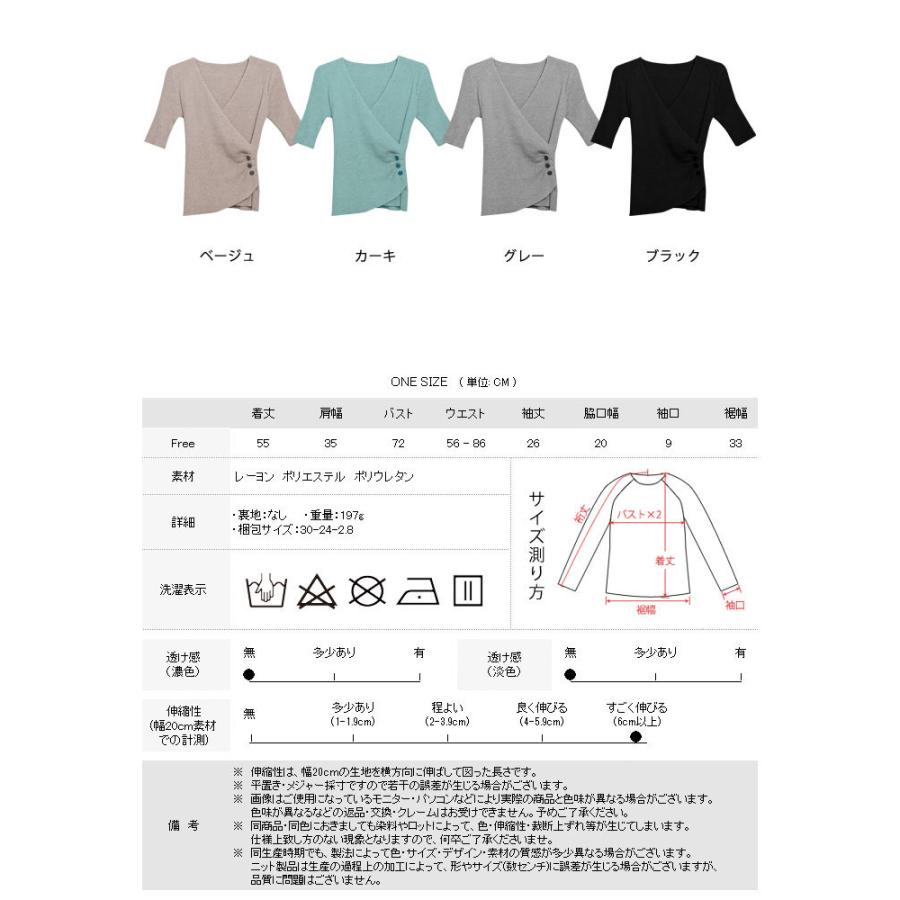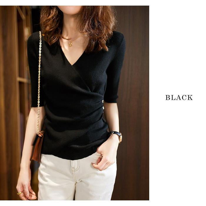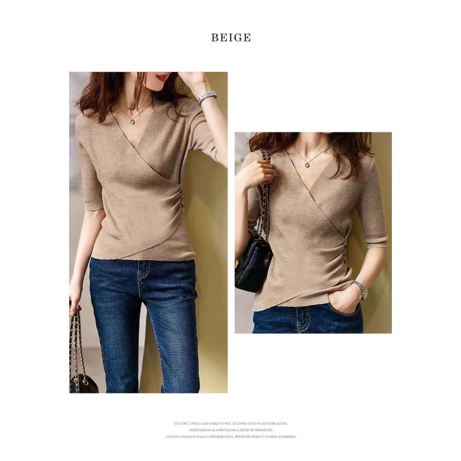 トップス レディース 春 ニット 無地 チュニック Vネック 5分袖 20代 30代 40代 ベージュ カーキ グレー ブラック ベーシック 大人 タイト