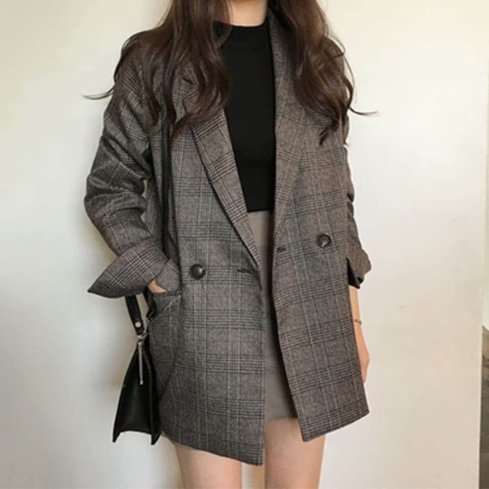 選べる2type グレンチェックテーラードジャケット スーツジャケットルーズブルゾン トレンチコート