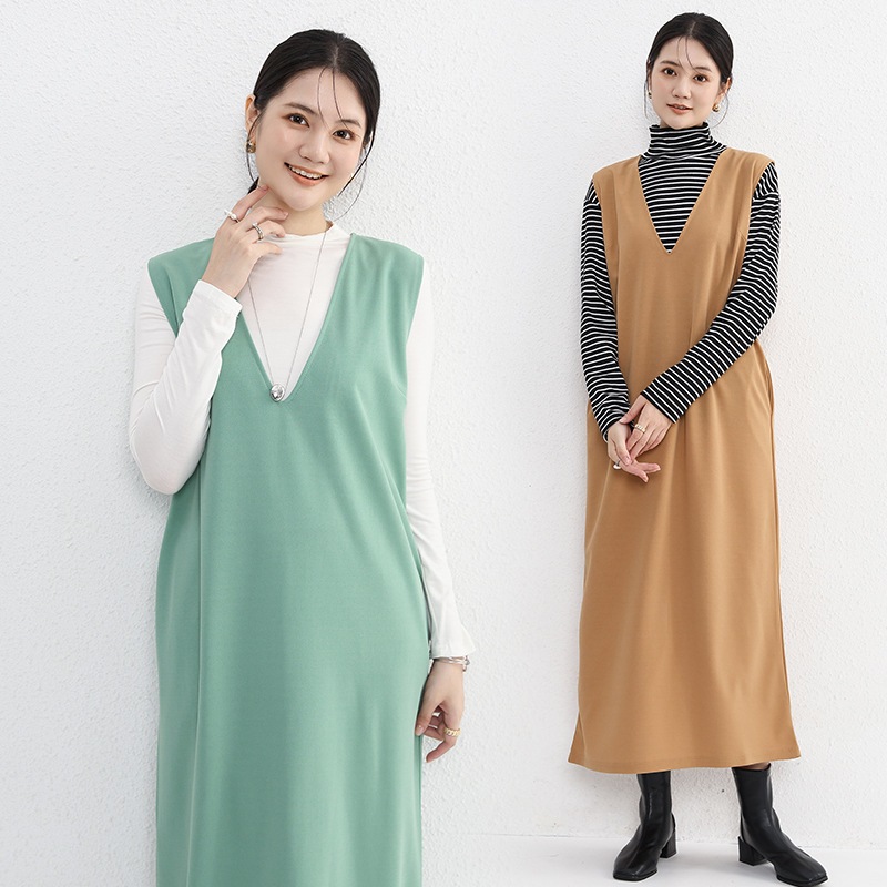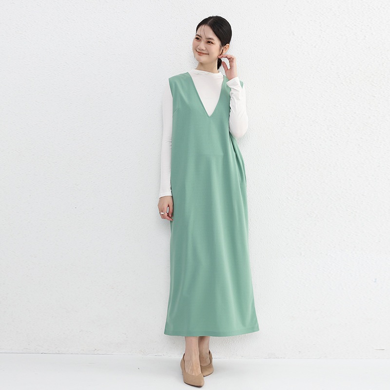 レディースファッション ノースリーブ Vネック ワンピース ドレープ感 膝丈 ベストドレス スリット付き ロングドレス レディース用 袖なしミニ 膝丈ワンピ