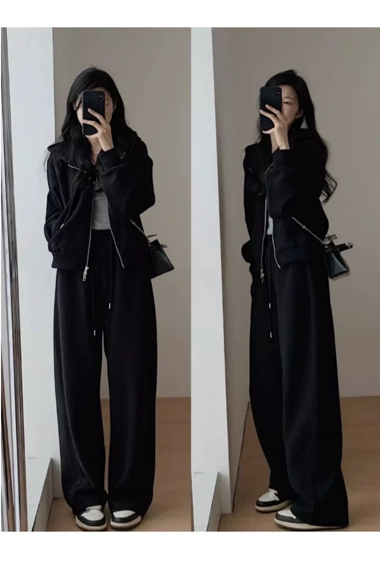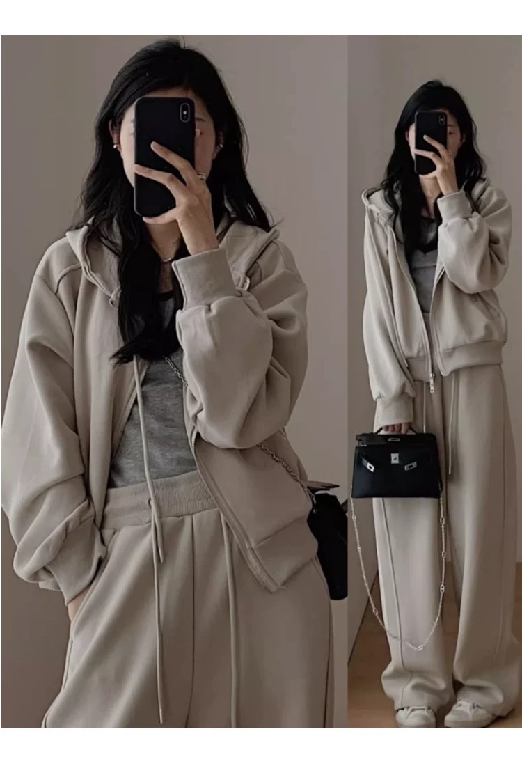 大好評新作 二点セット パーカー+ワイドパンツ無地 薄手 裏起毛スウェット セットアップ 韓国ファッション 脚長効果ズボン ストレート ゆったり カジュアル 着やせ大きいサイズ