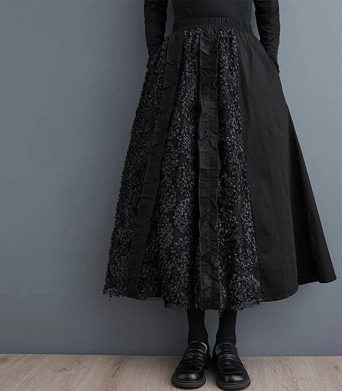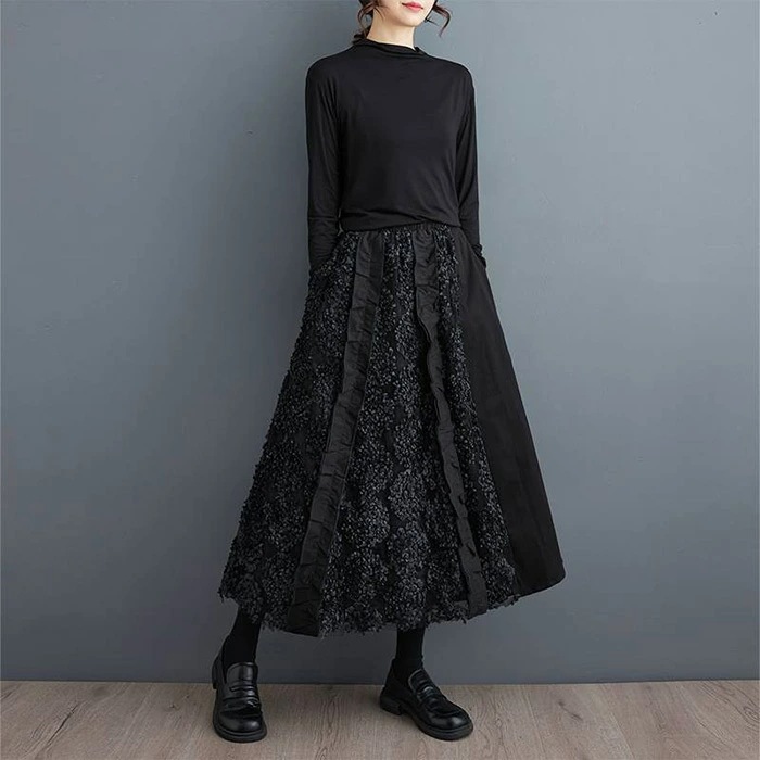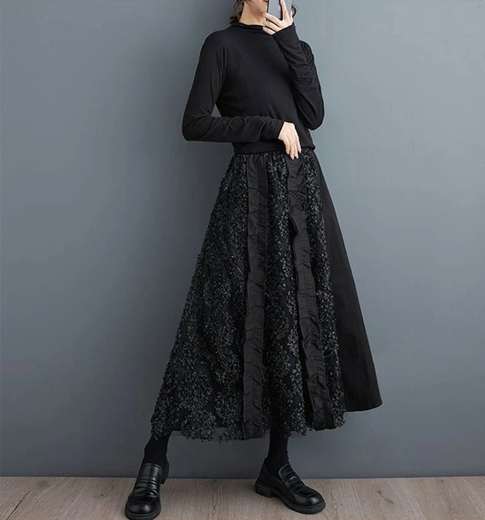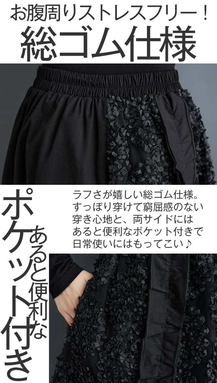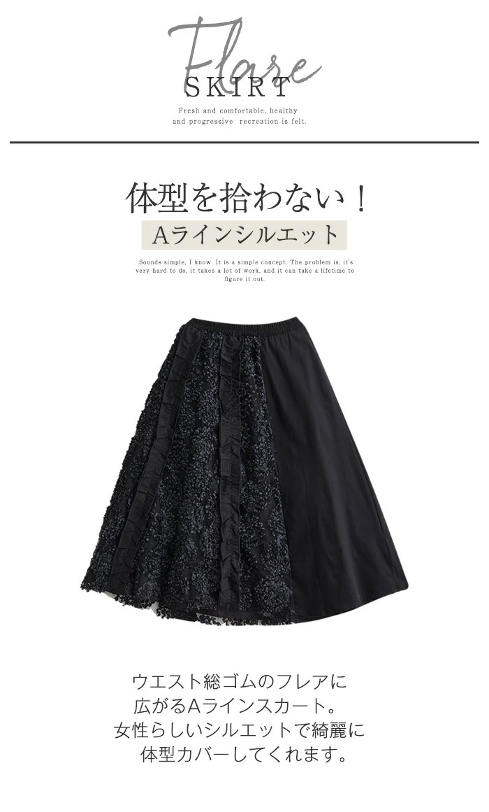 スカート ロング丈 異素材切替え ロングスカート 秋 冬 フレアスカート 大きいサイズ ボトムス 体型カバー ロング ミモレ丈 Aライン フレア ウエストゴム ゴム レディース カジュアル エレガント