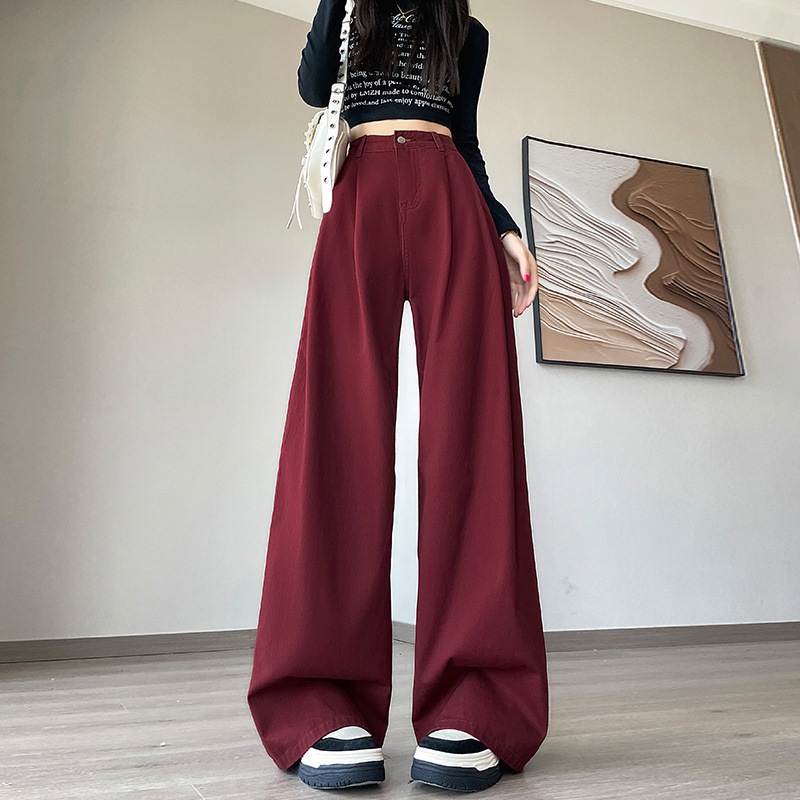 アメリカのレトロな赤いジーンズ女性秋の新型ハイウエストは股を覆って痩せたしわのデザイン感があるストレートパンツ ロングパンツ