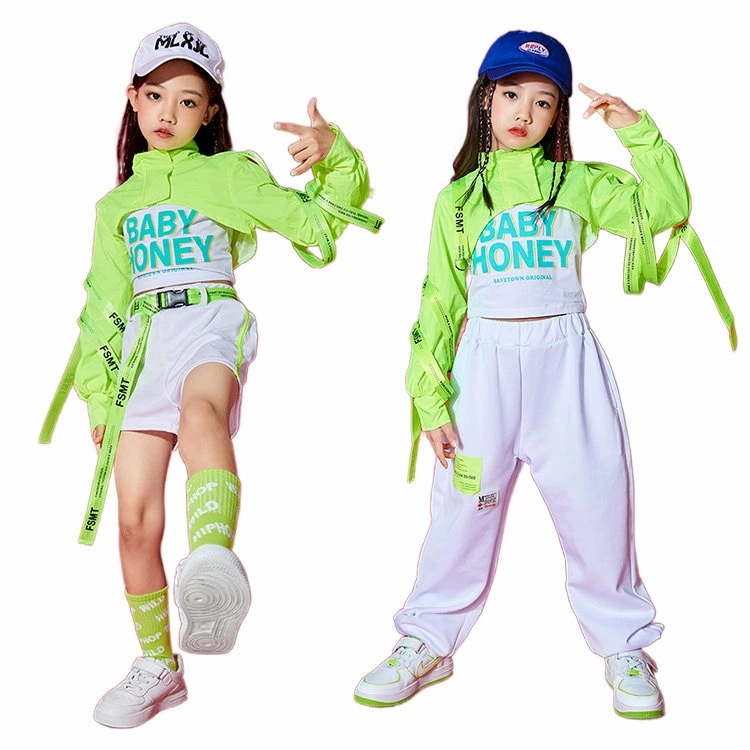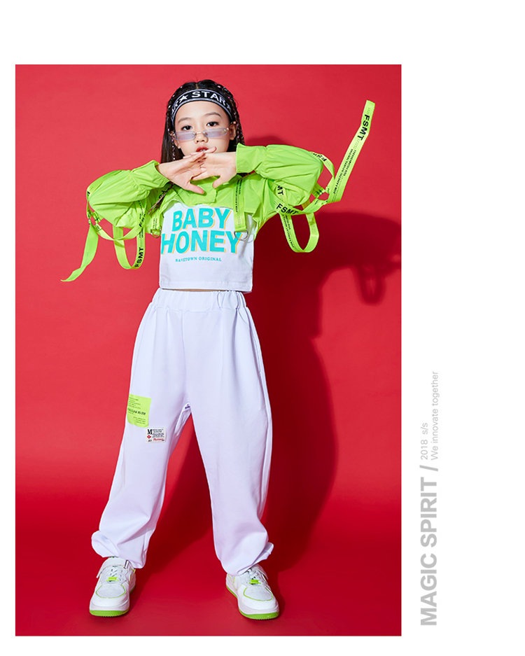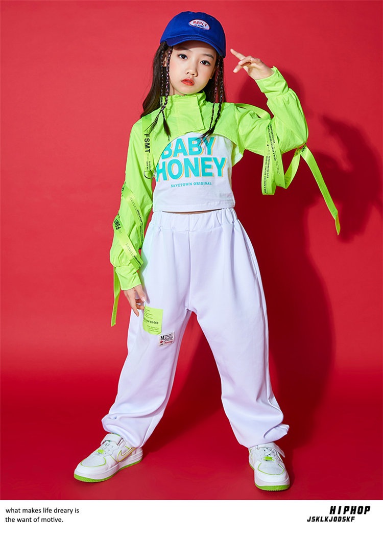 蛍光緑 トップス 女の子 ダンス 衣装 セットアップ 白パンツ ガールズ ジャズ hiphop ヒップホップ 韓国 k-pop ステージ 演出服 舞台 発表会 おしゃれ 上下セット 110-180cm