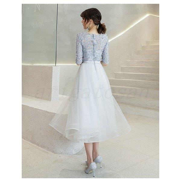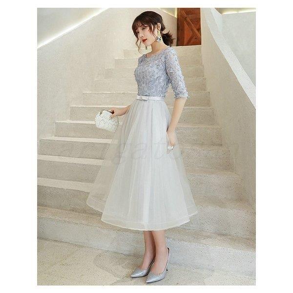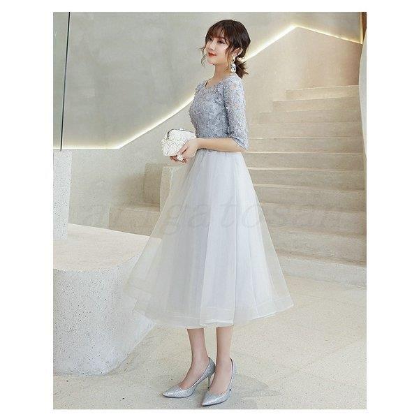 パーティードレスミモレ丈結婚式ワンピースフォーマルドレスグレー結婚式ドレス五分袖お呼ばれ服服大きいサイズ大人上品女性203040 ドレス
