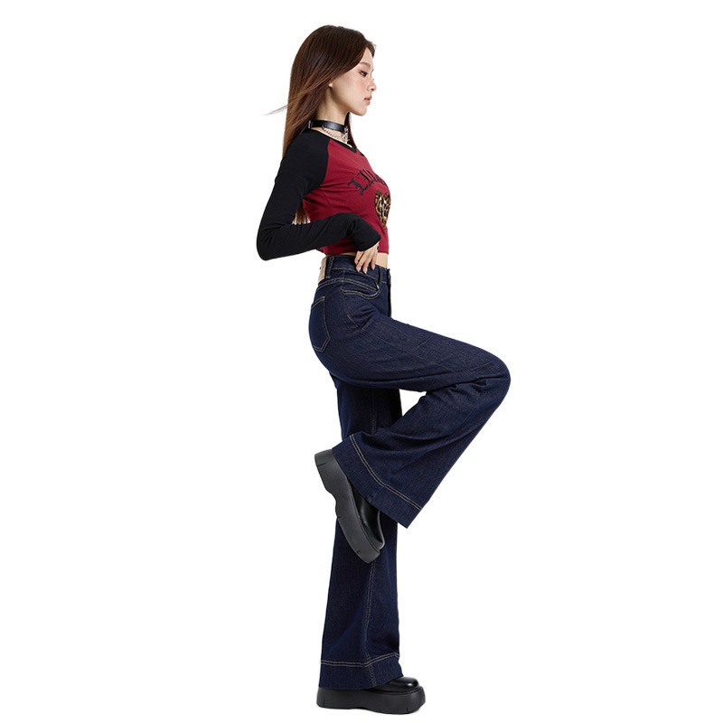 秋の新型高腰弾力ラッパズボンがゆったりとしていてジーンズの長ズボンが長くなっています ロングパンツ