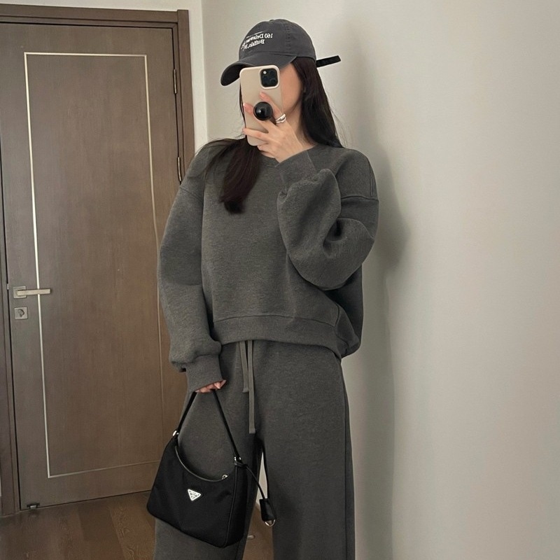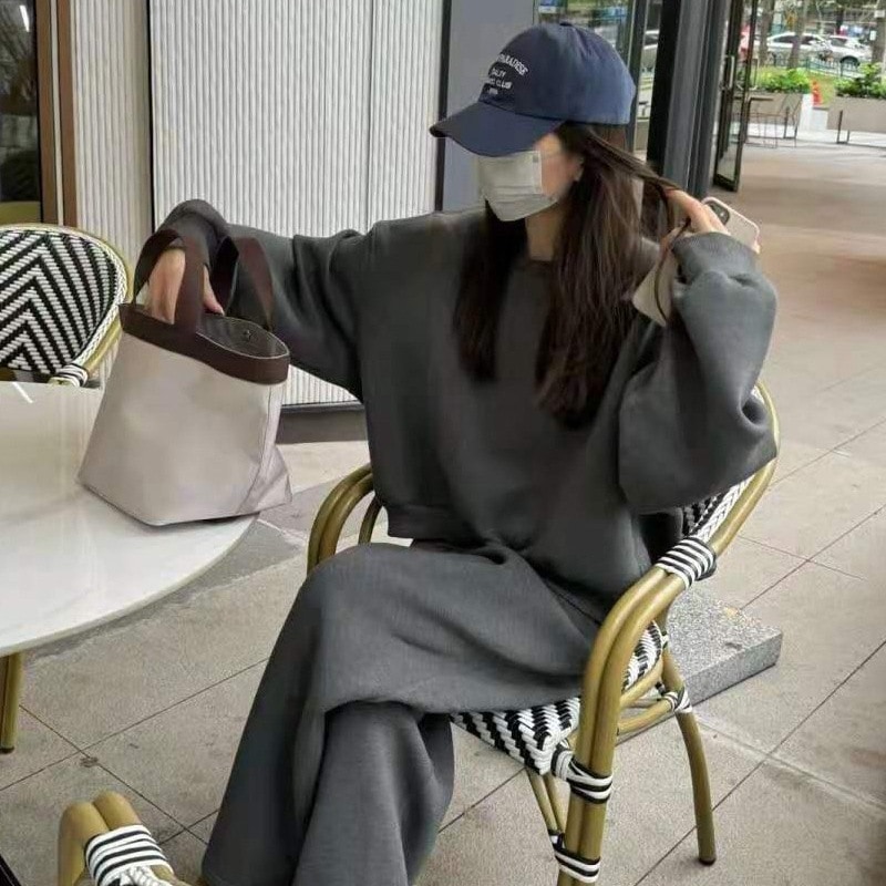 韓国ファッション レディース セットアップ 冬のセータースポーツスーツ女性緩い薄いランニング服無地ツーピーススーツ セットアップ
