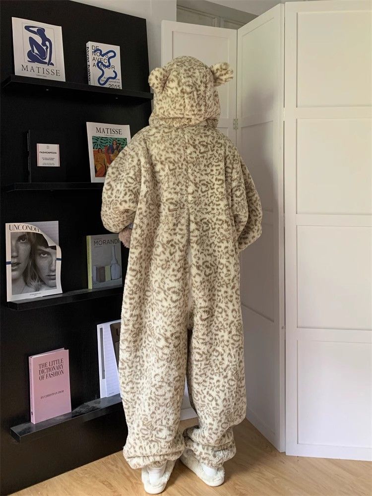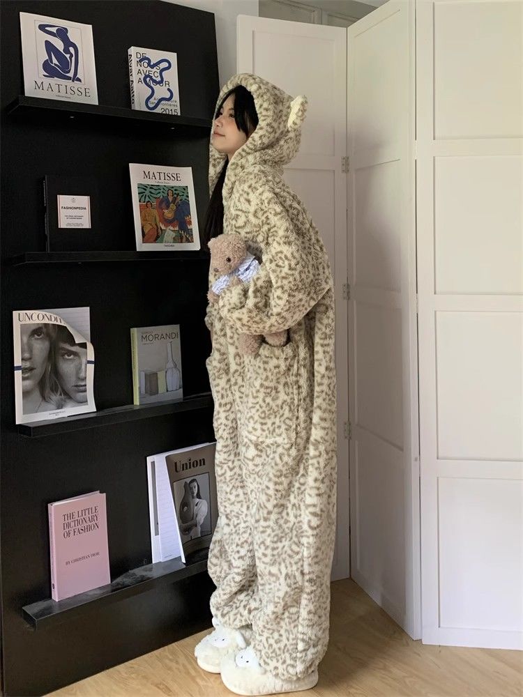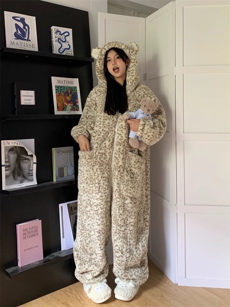 オールインワン パジャマ セット アウター 秋 冬 厚手 セット 豹柄 もこもこパジャマ ルームウェア パジャマセット 着ぐるみパジャマ 韓国ファッション