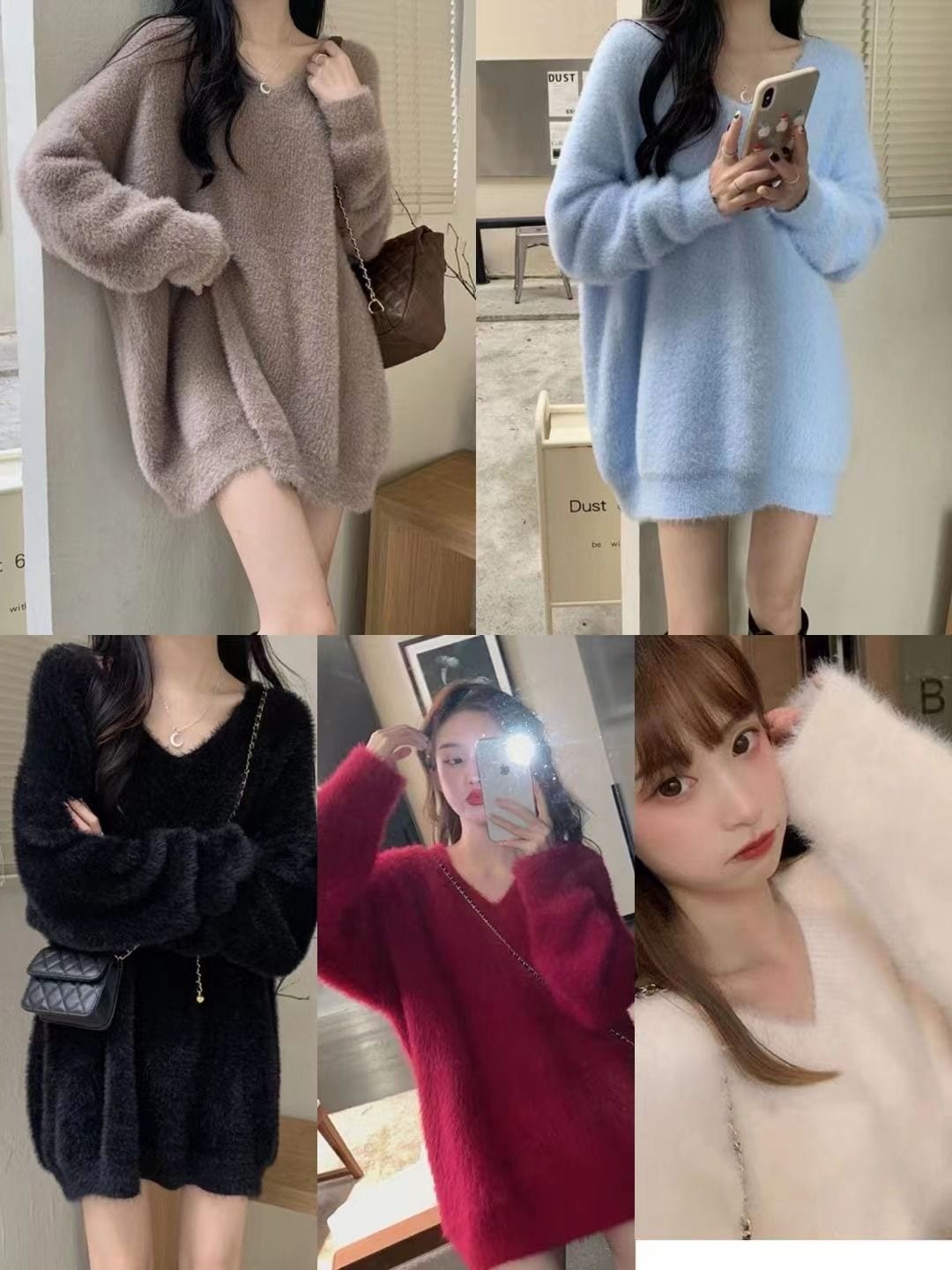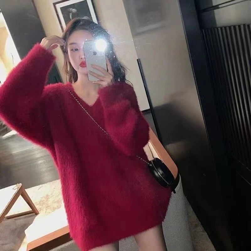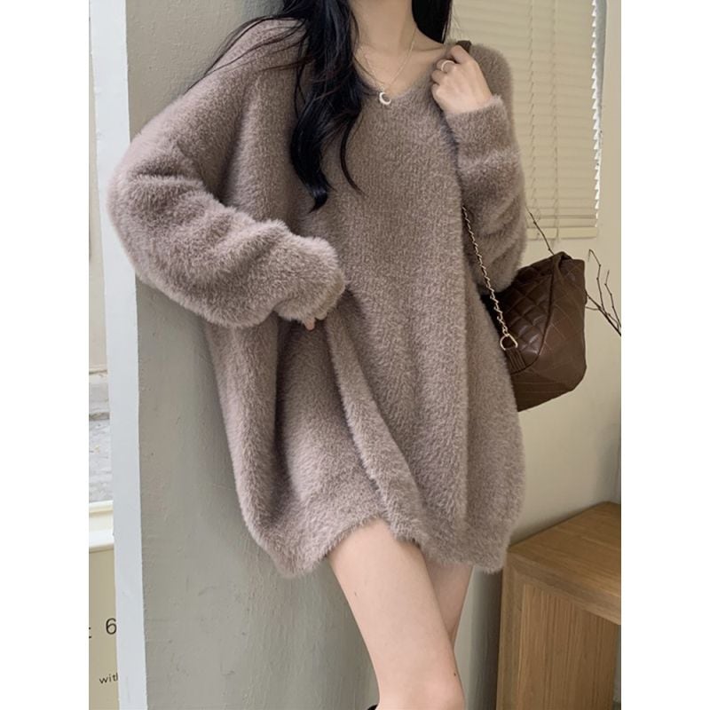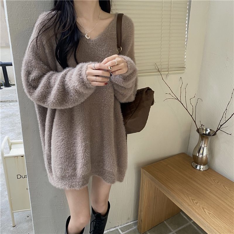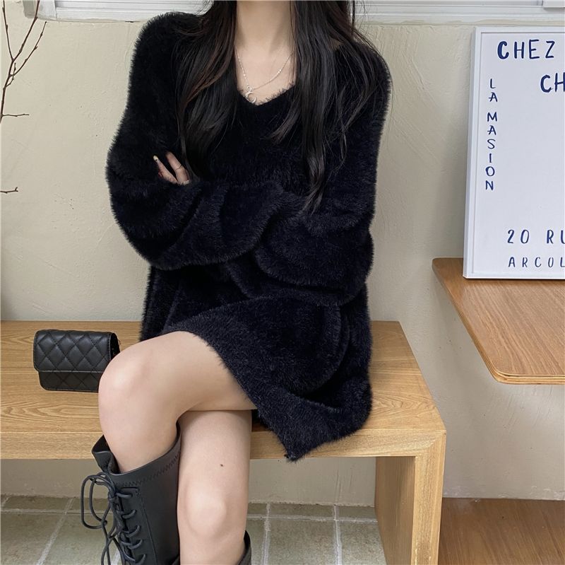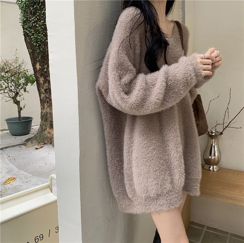 セーター ゆったりスウェットベーシックニット 冬でもブラウス パーカー ラウンドネックニット ニットセーター セミロング フェイクミンク ゆったり