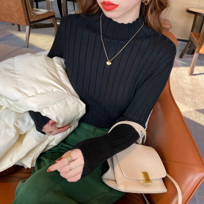ニットセーター リブニット ストレッチ プチハイネック 長袖 レディース リブプチハイネック プチタートルネック トップス セーター リブ ハイネック 伸縮性 暖か