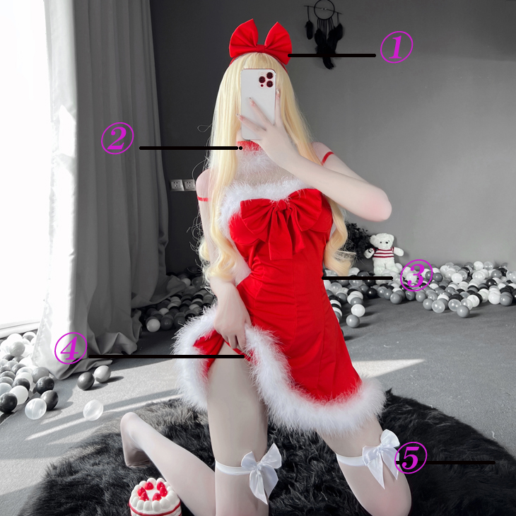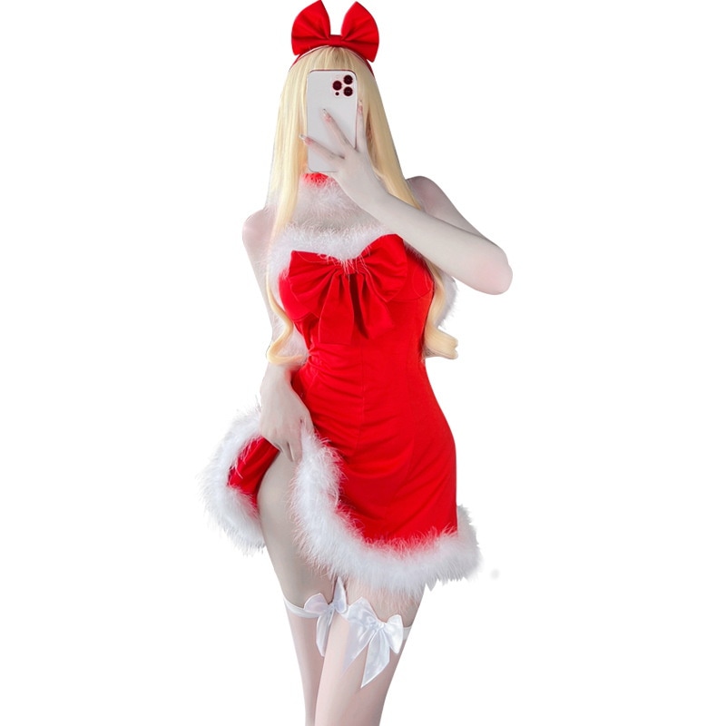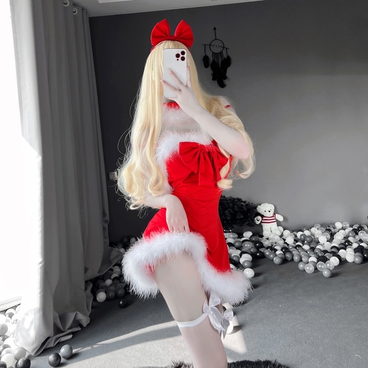 クリスマスコフレ サンタコスプレ ワンピースタイプ 背中開き ふわふわ ストッキングセット リボン レッド サンタコス コスチューム クリスマス 衣装 セクシー サンタクロース パーティ ミニスカ セ