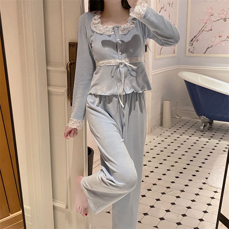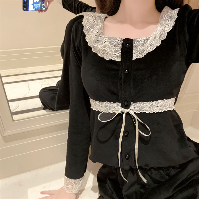 韓国ファッション パジャマ着 胸当て付き 秋冬 甘いレース長袖スーツ パジャマ