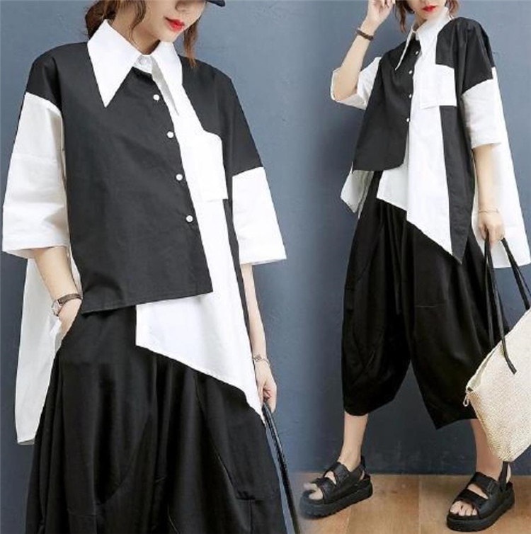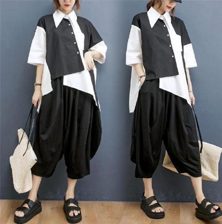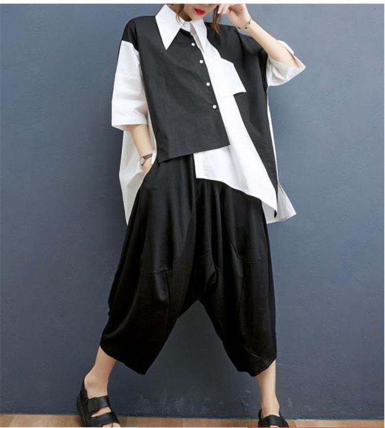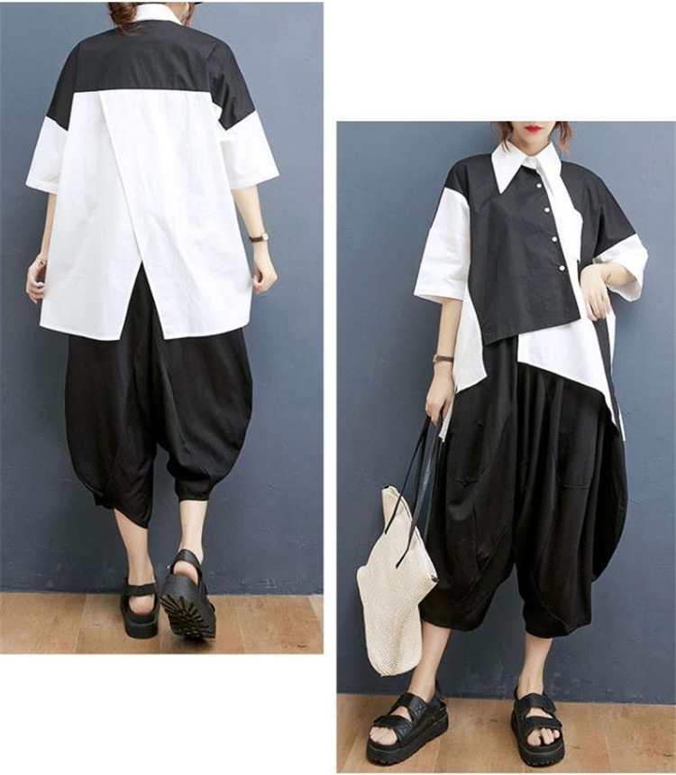今日更新2点セットレディースセットアップ イレギュラーシャツ+ワイドレッグパンツ カジュアルな場や通勤 上下セット パンツスーツ