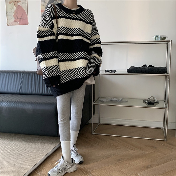 大きいサイズの春と秋の冬の新型の縞の韓国系の頭をかぶるセーター女性はゆったりとだるい外はやせて見えるニットのセーターの上着を着ます ニット