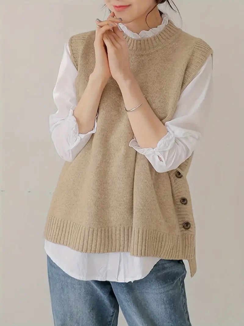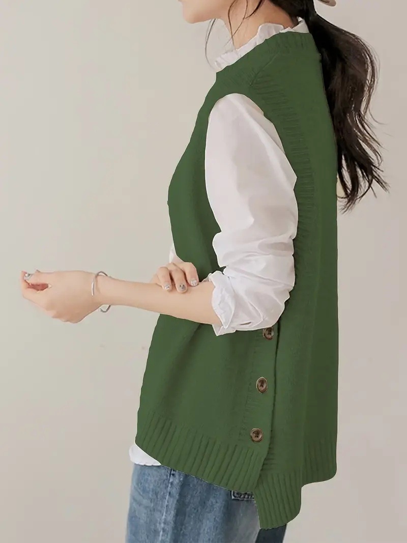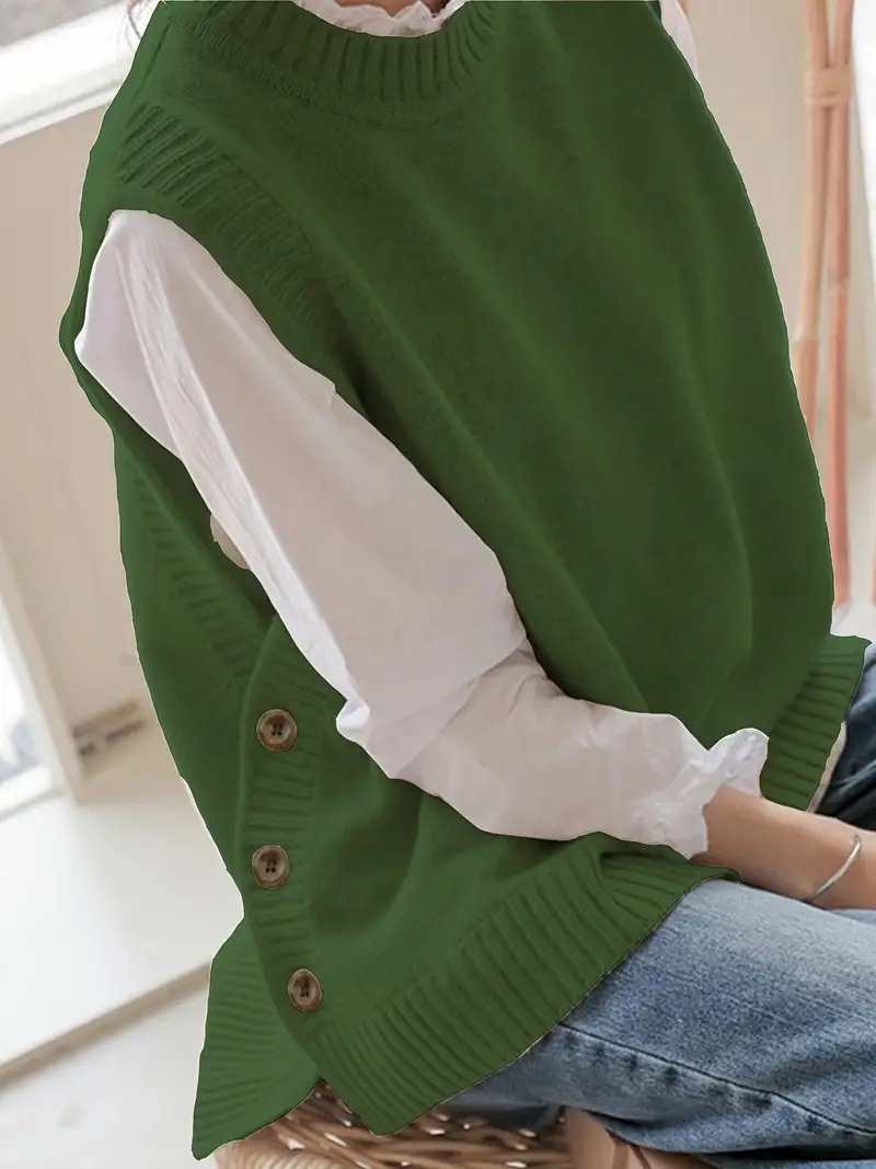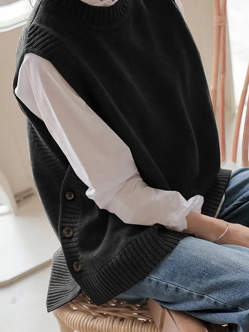 サイドボタンクルーネックセーターベストカジュアルな無地スリーブレスニットベスト春と秋のレディースウェア カーディガン