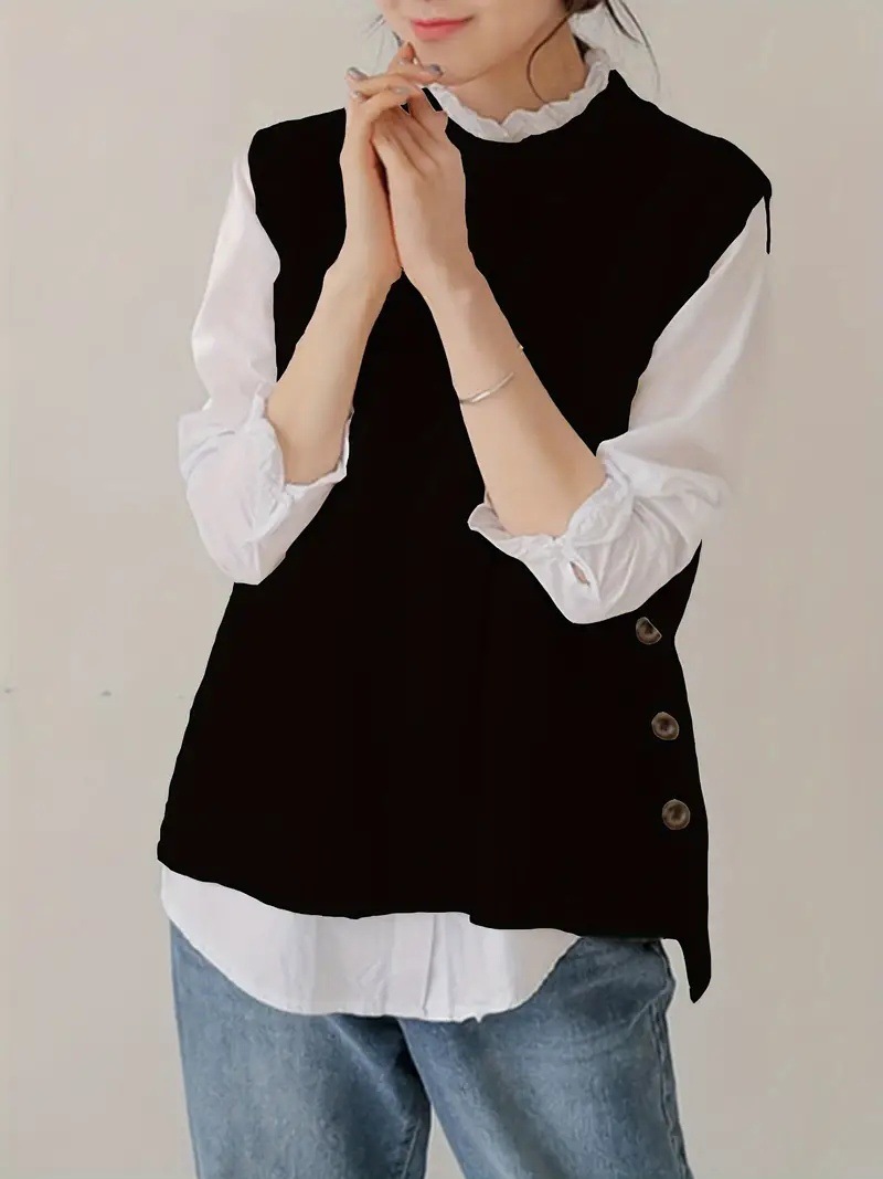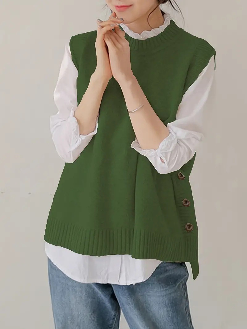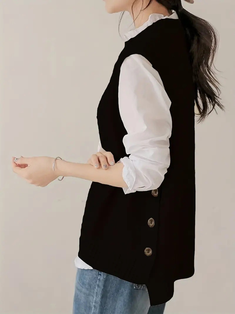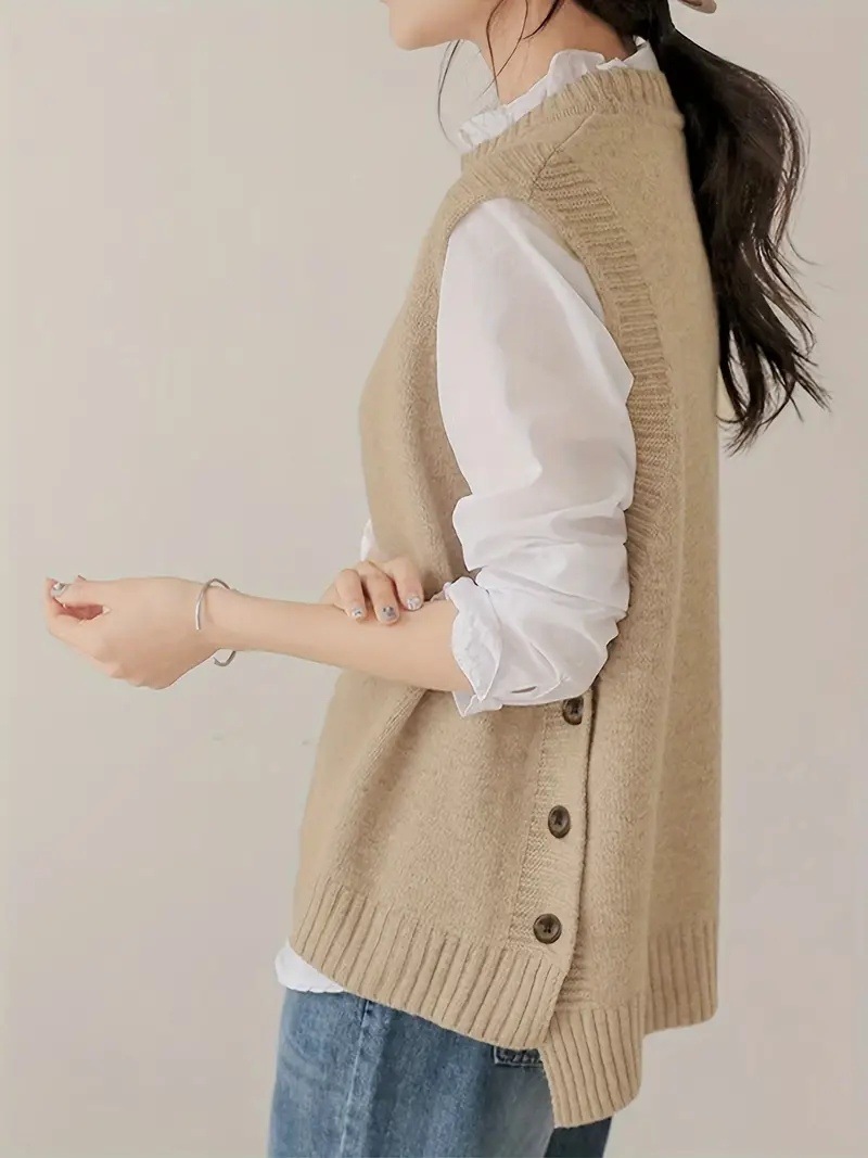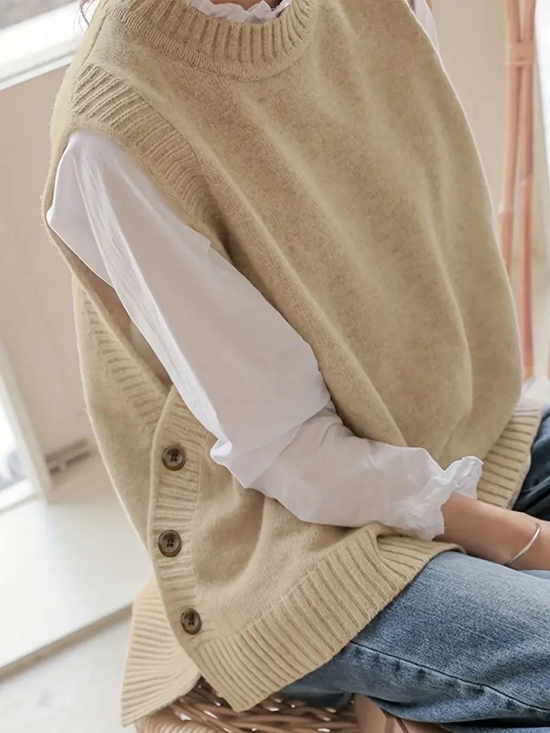 サイドボタンクルーネックセーターベストカジュアルな無地スリーブレスニットベスト春と秋のレディースウェア カーディガン