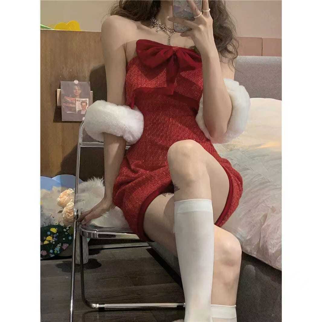 ハロウイン のスーツの洋気の齢を減らして純欲します風クリスマス新年王女風腰を直して赤い蝶の結び目のワンピース サンタコスプレ レディース クリスマス