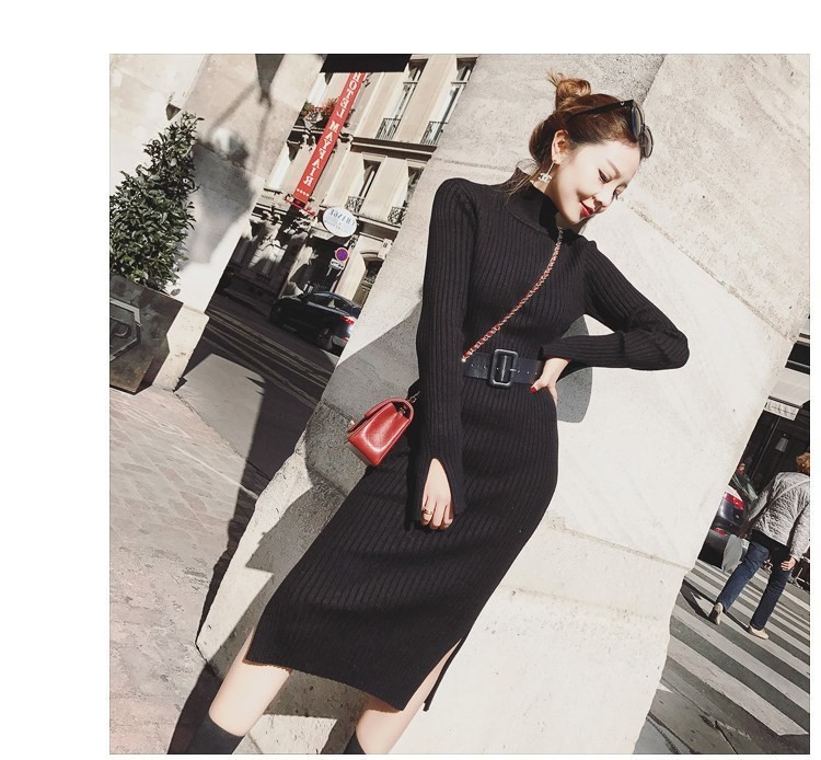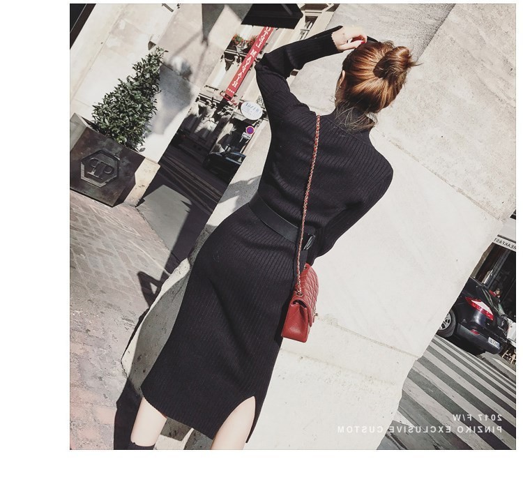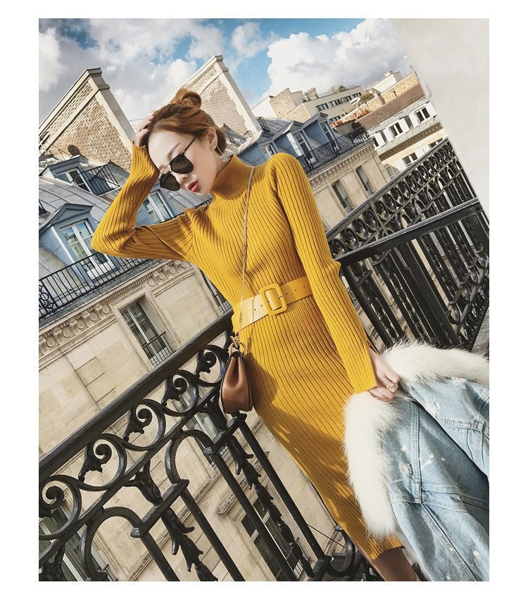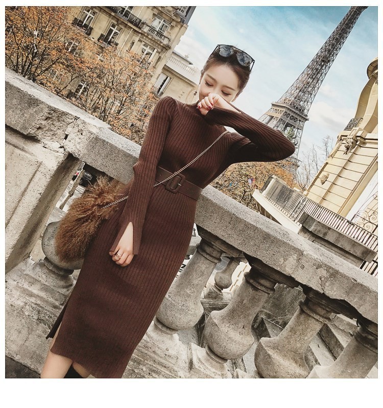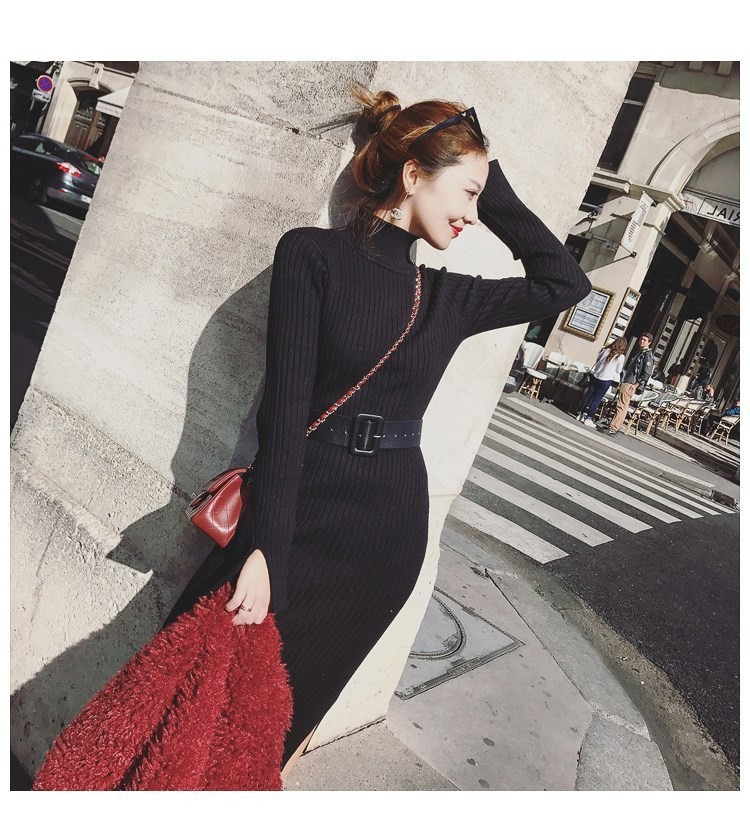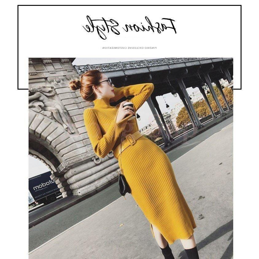 大人の魅力 ニットワンピースレディース長袖ベルト付き秋冬膝丈オフィスハイネック無地カシュクール体型カバープリーツワンピース上品着痩せ ニットワンピ