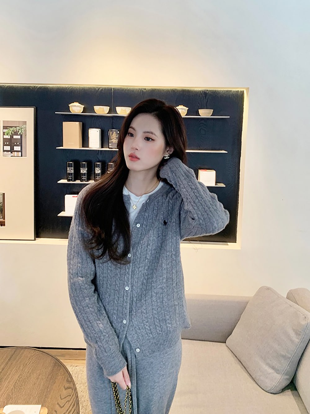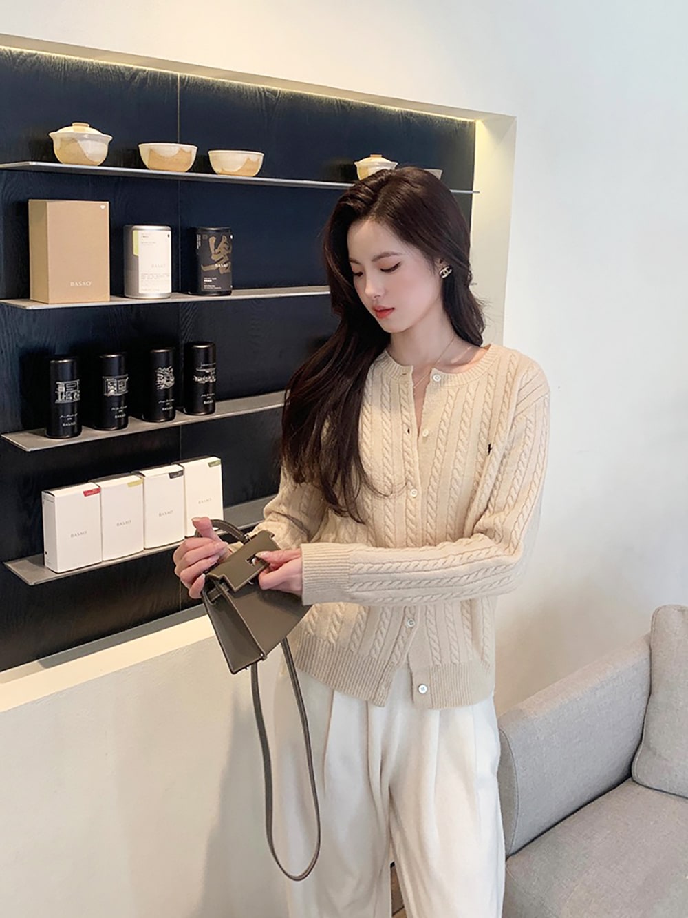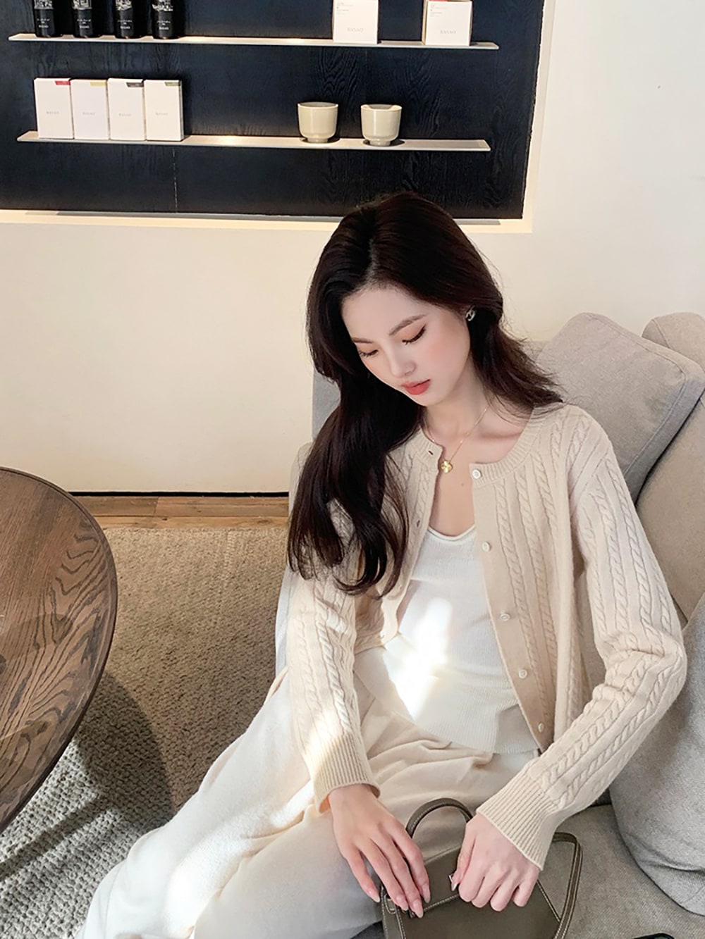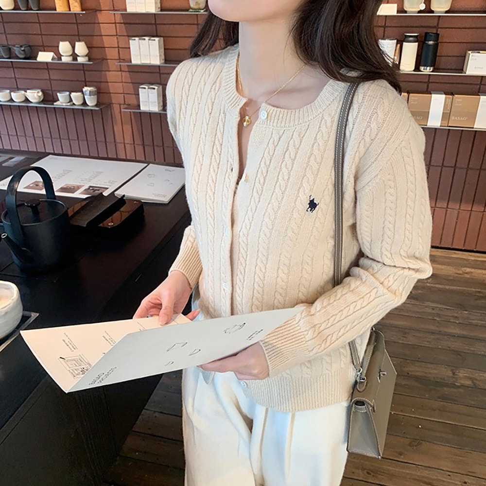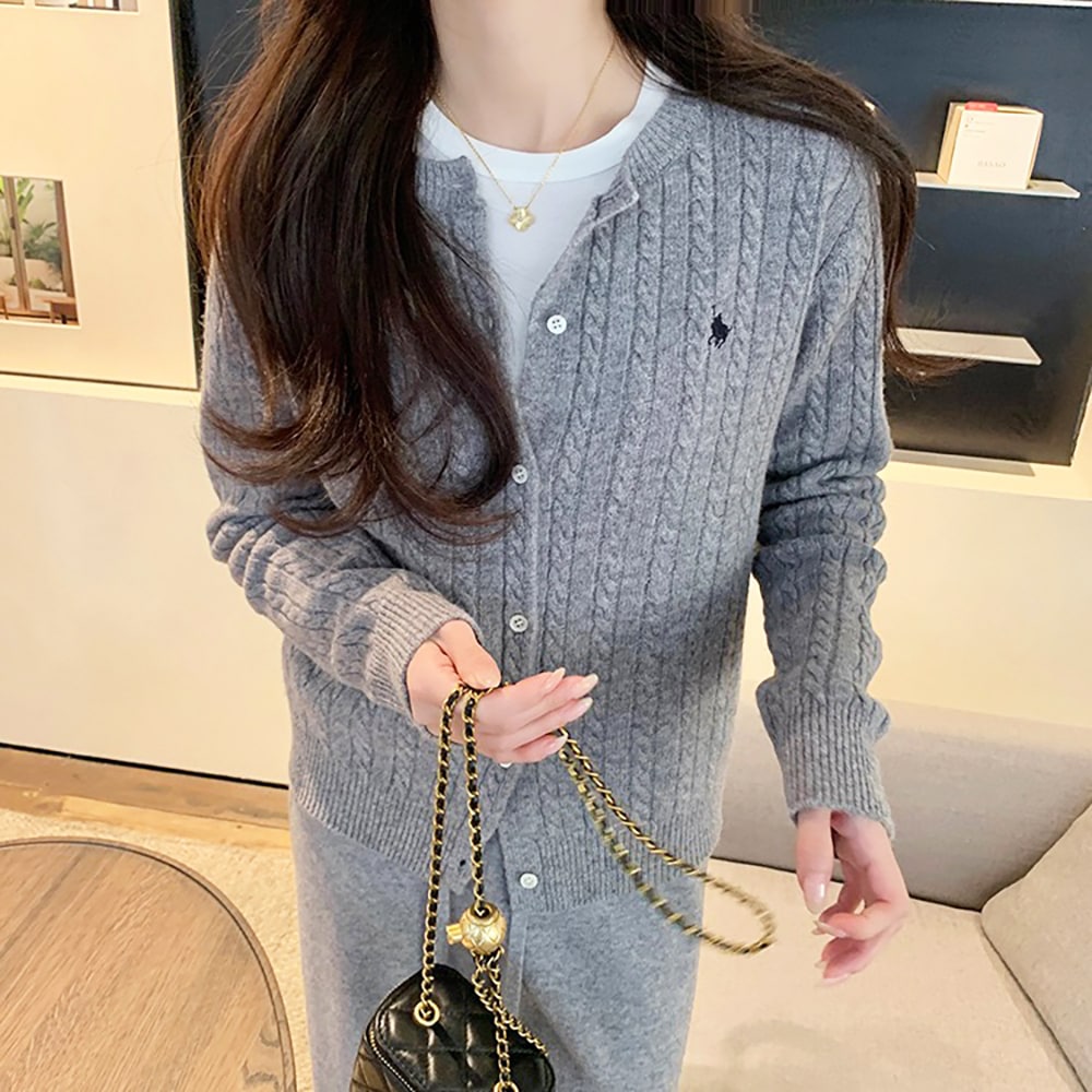 韓国ファッションケーブルクルーネックニット プリント 長袖 ボタン ドロップショルダー カーディガン カーディガン
