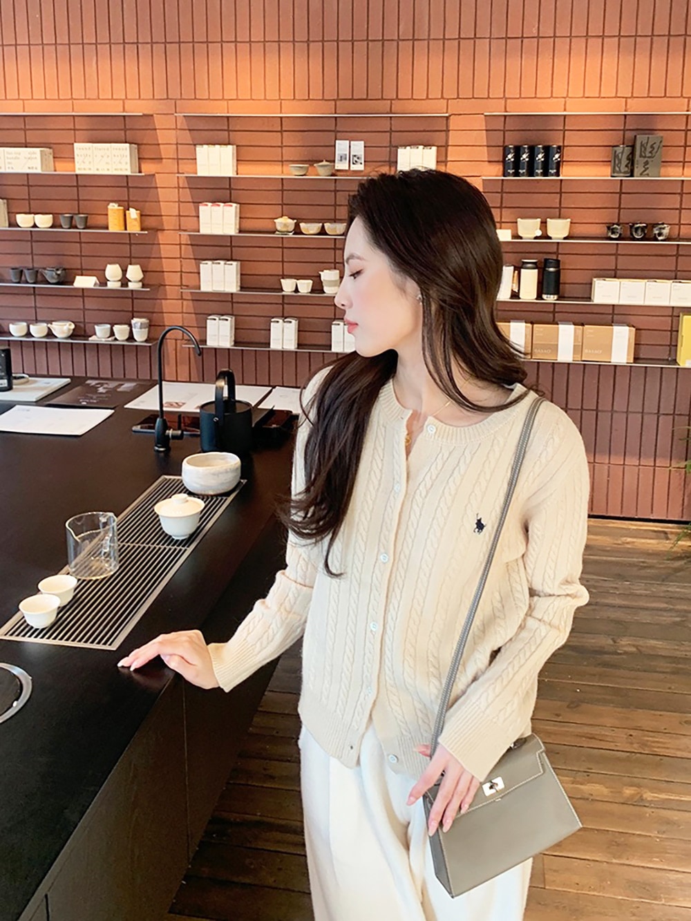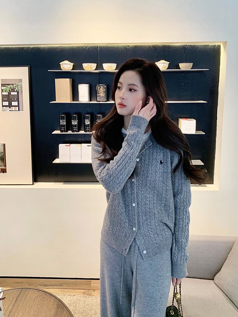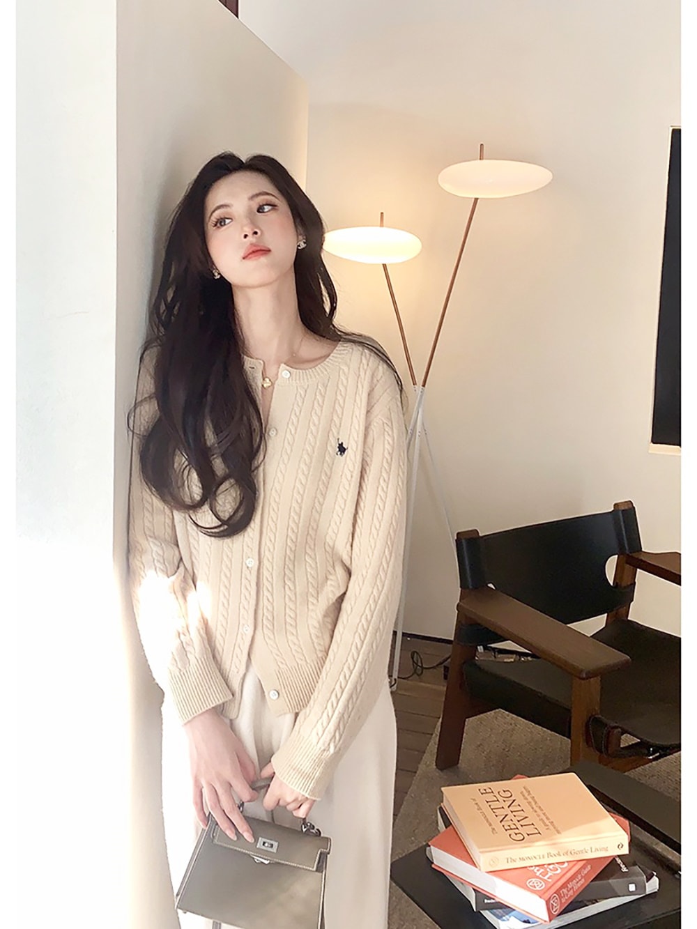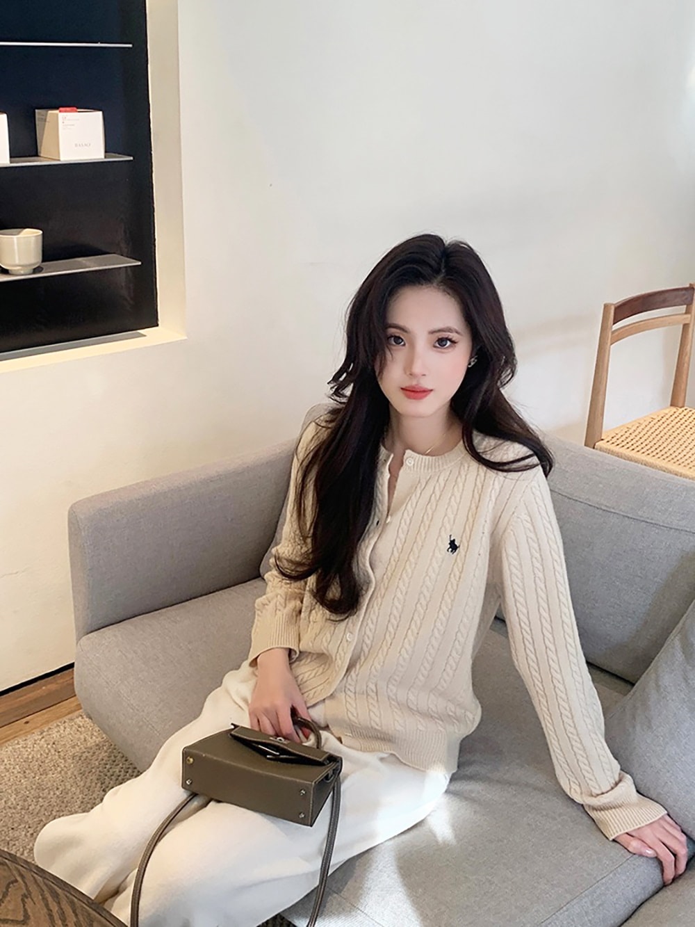 韓国ファッションケーブルクルーネックニット プリント 長袖 ボタン ドロップショルダー カーディガン カーディガン