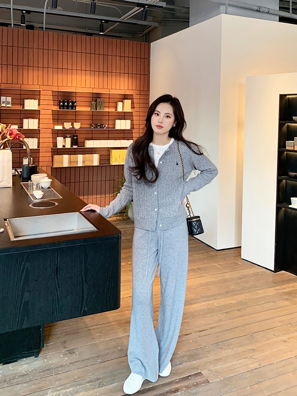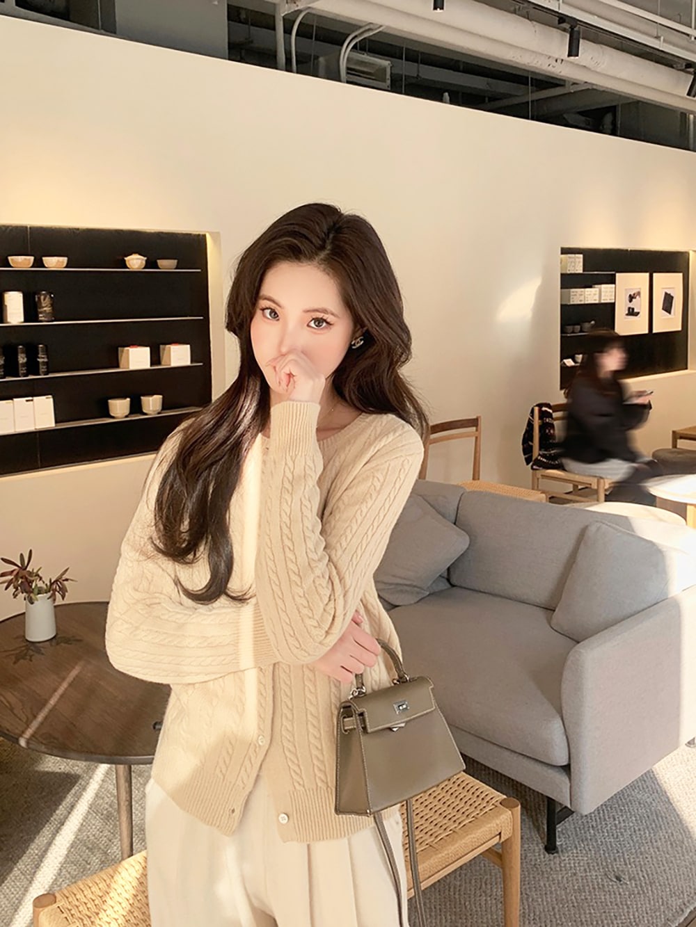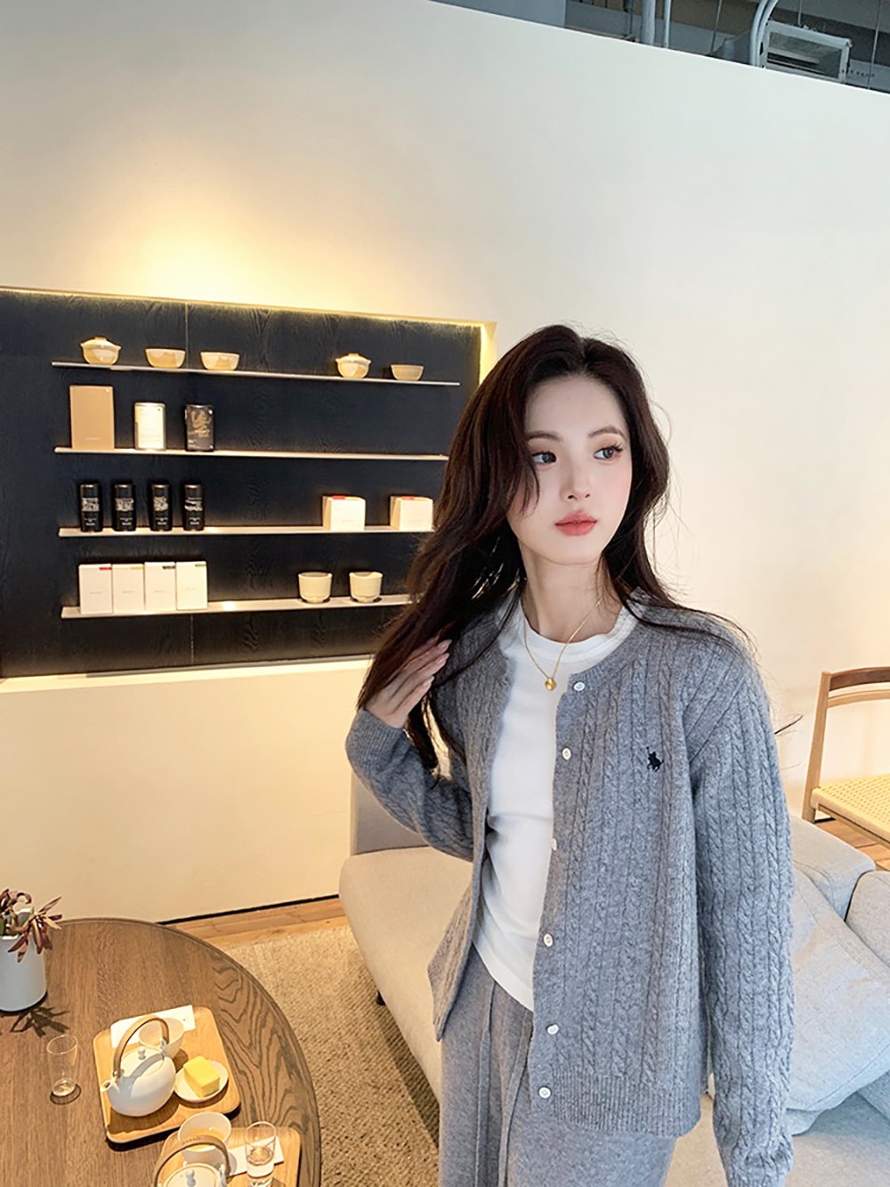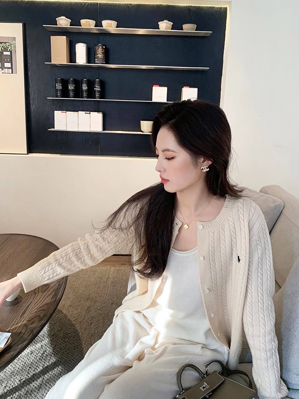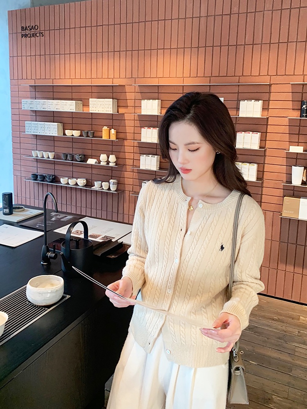 韓国ファッションケーブルクルーネックニット プリント 長袖 ボタン ドロップショルダー カーディガン カーディガン