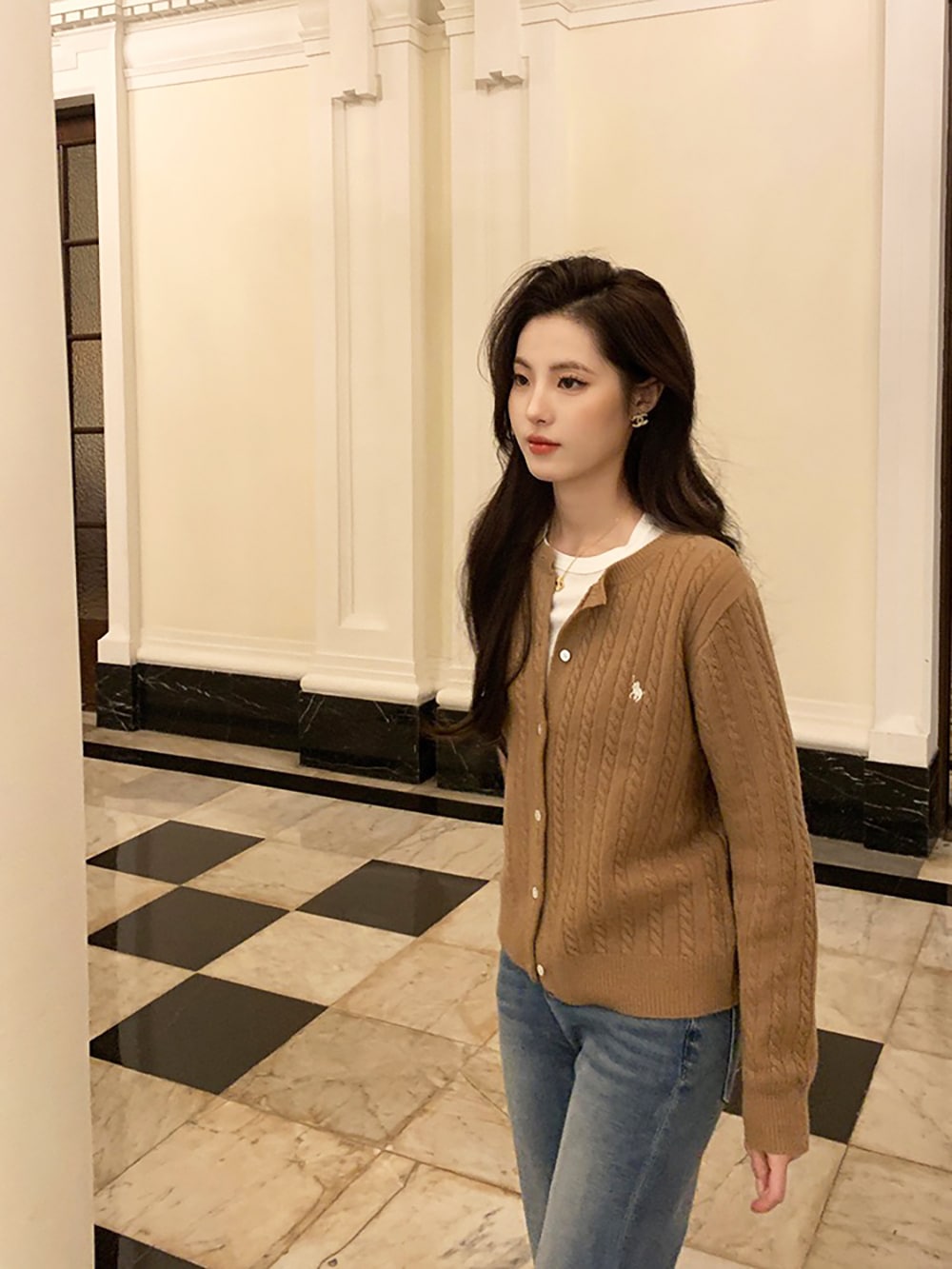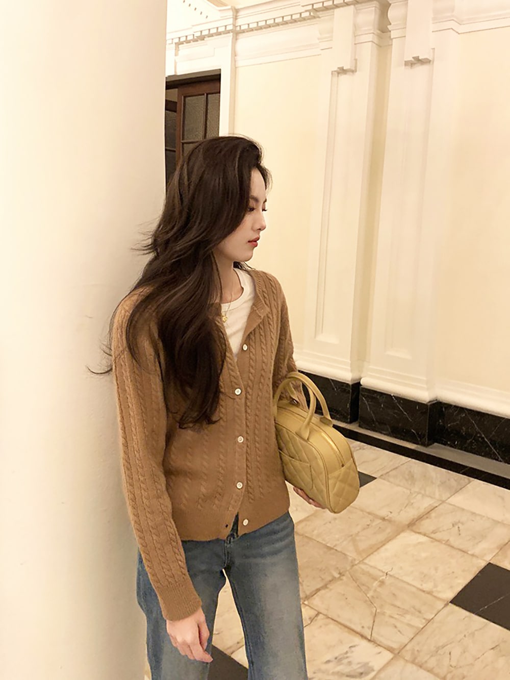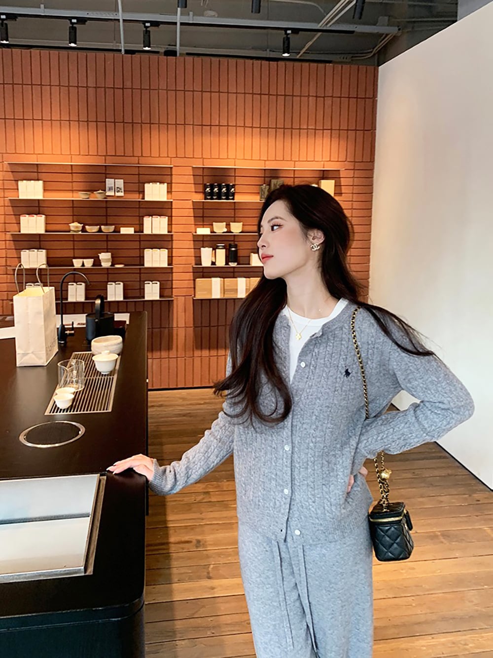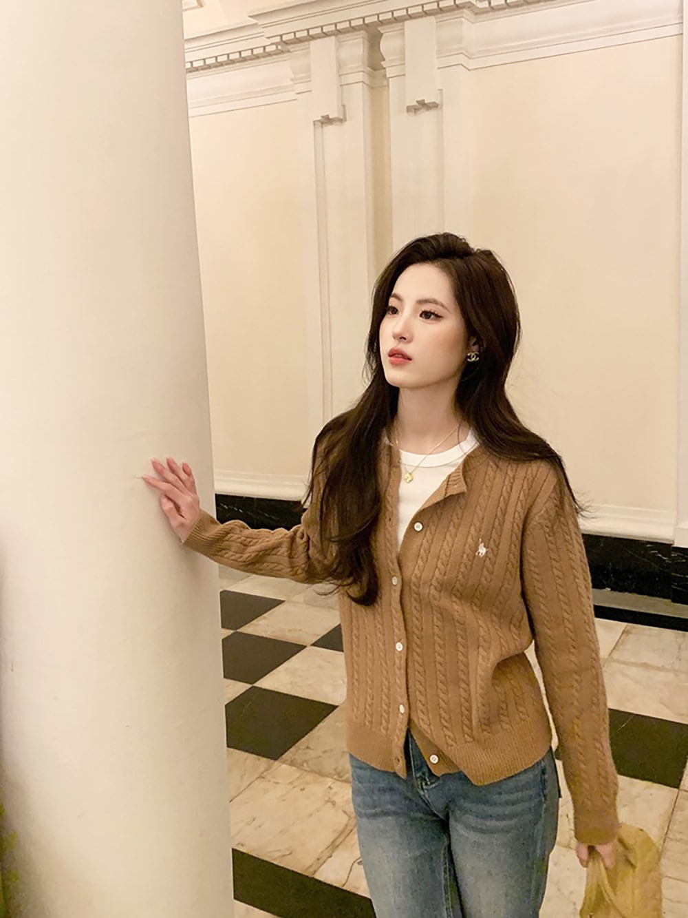 韓国ファッションケーブルクルーネックニット プリント 長袖 ボタン ドロップショルダー カーディガン カーディガン