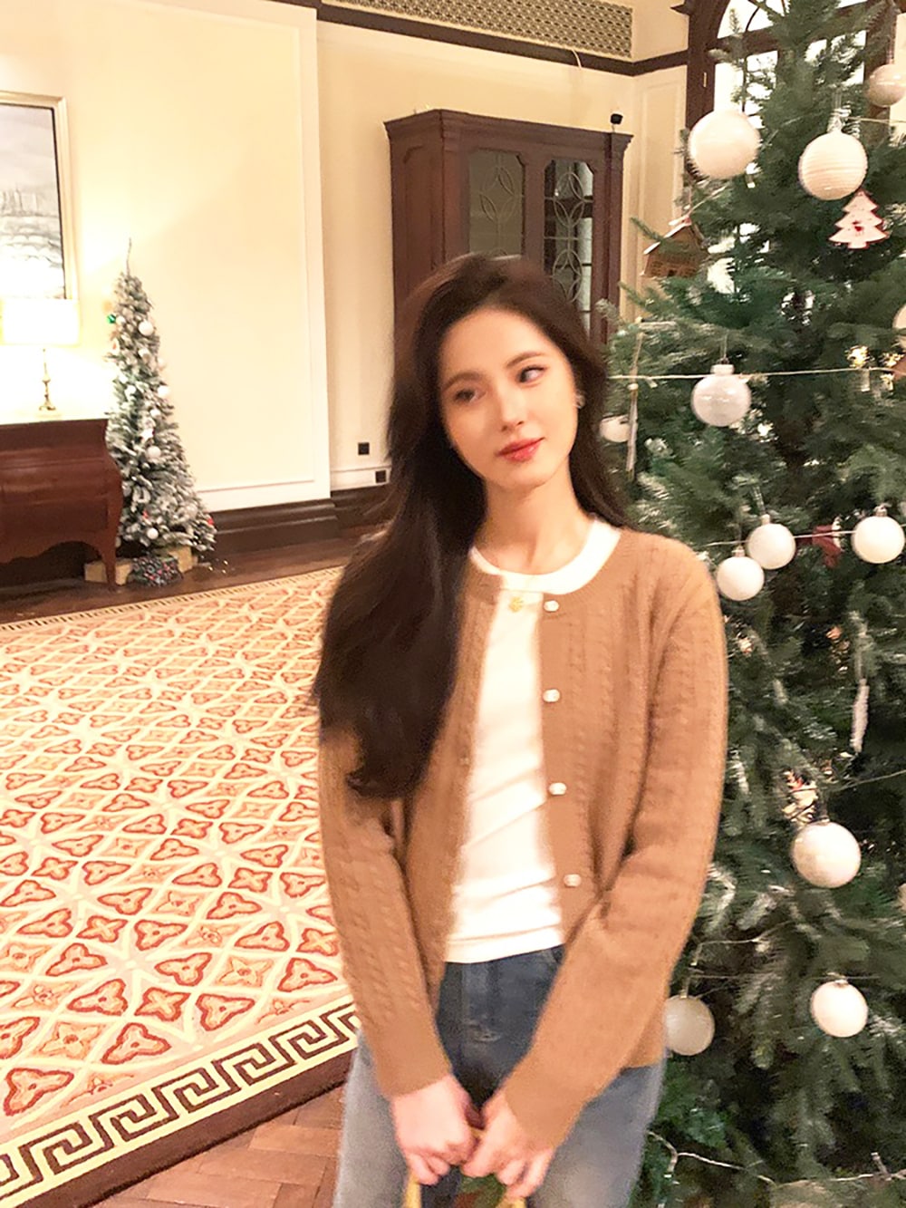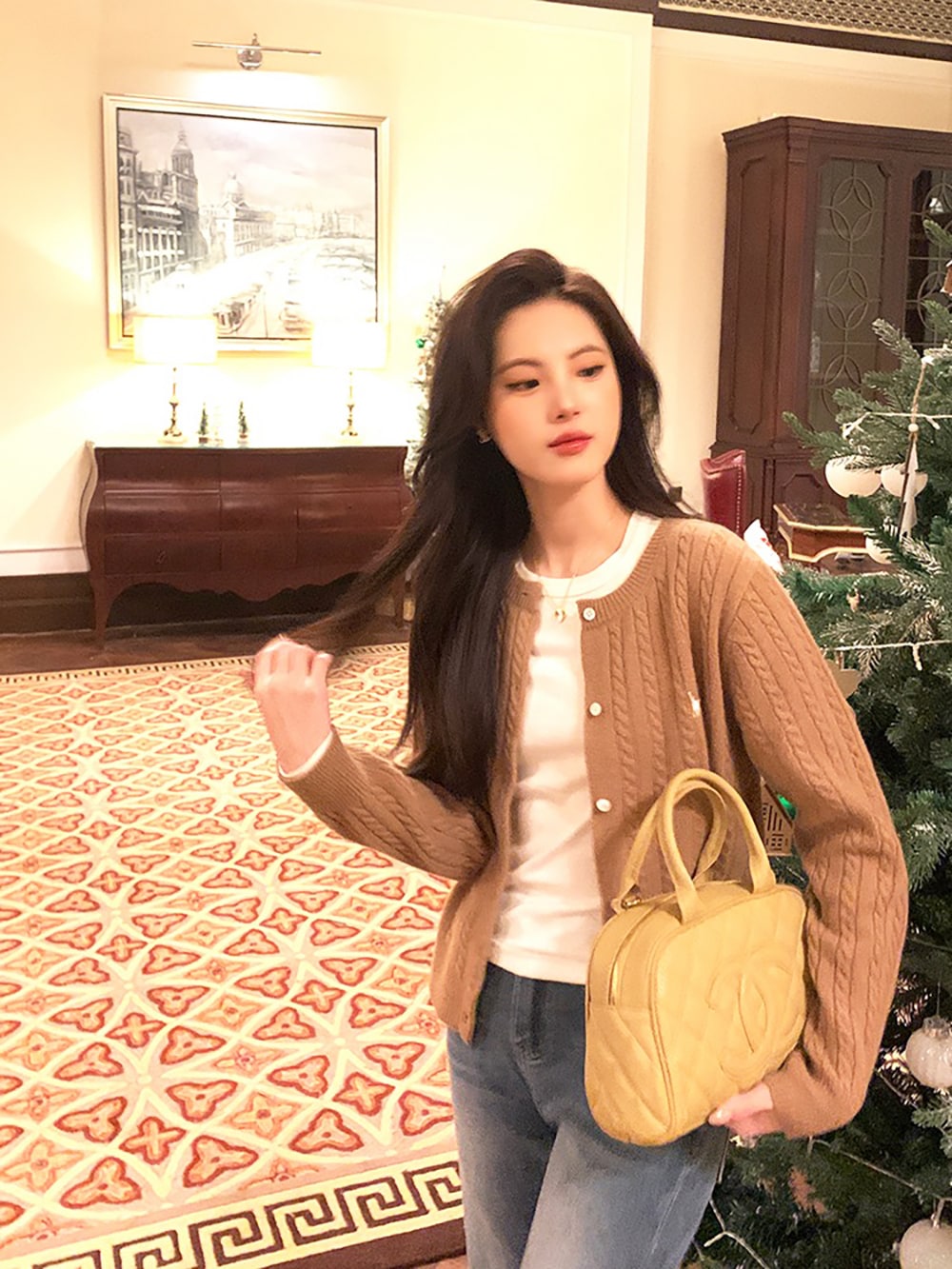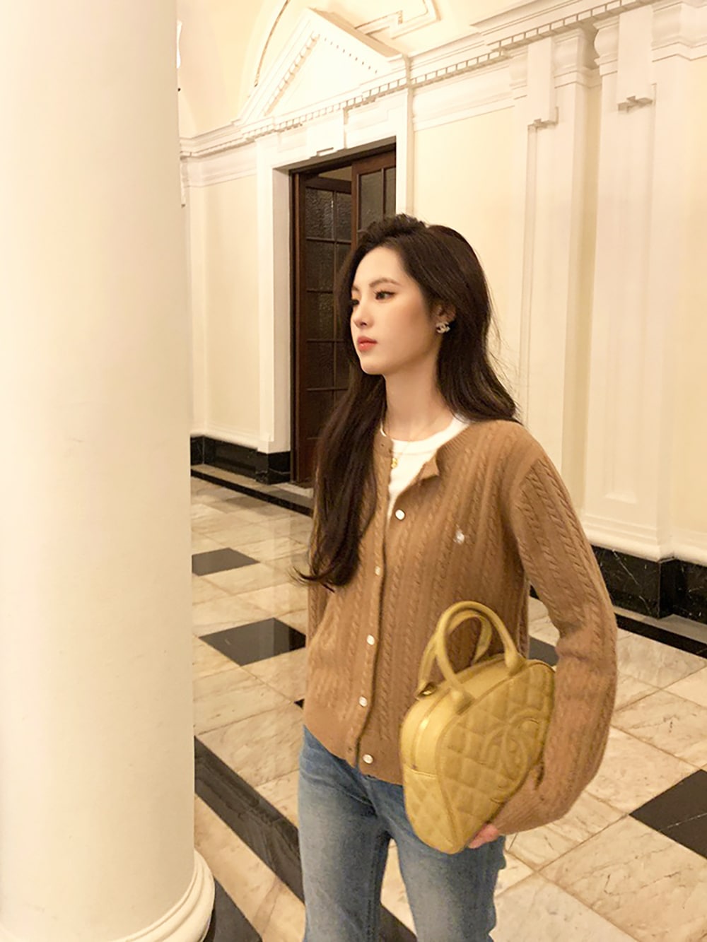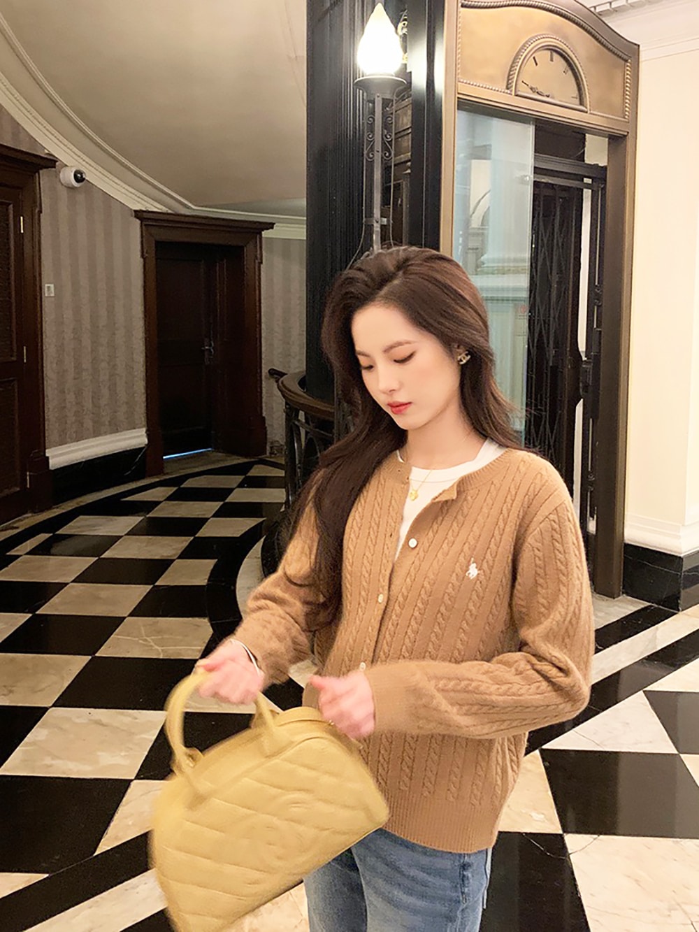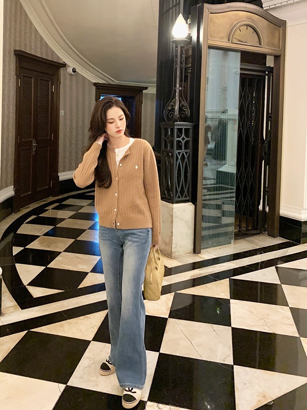 韓国ファッションケーブルクルーネックニット プリント 長袖 ボタン ドロップショルダー カーディガン カーディガン