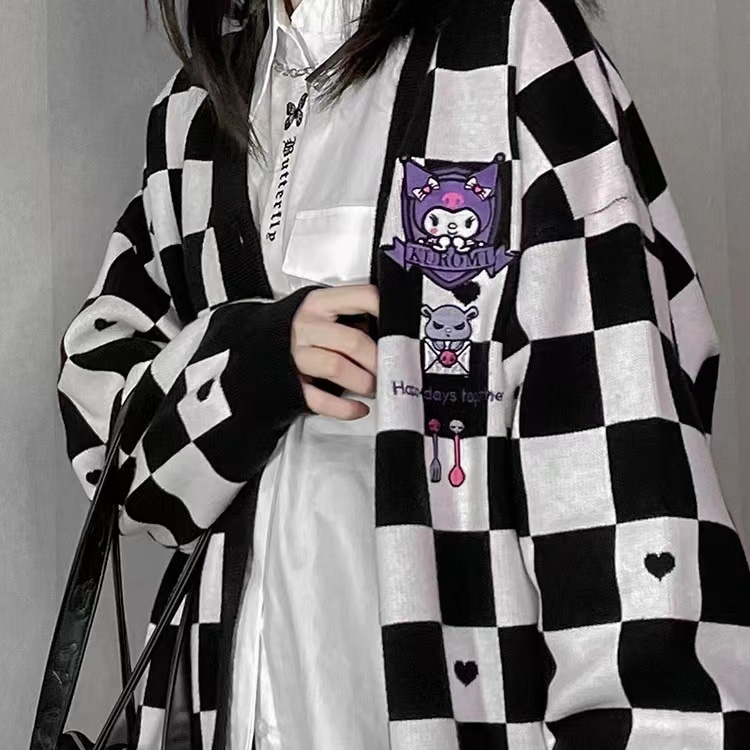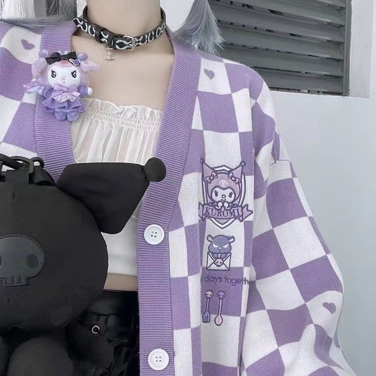 サンリオ 5種類シナモロールキャラクター刺繍チェックニットカーディガン レディース薄手 前ボタン 前開き 春秋 ポムポムプリンクロミちゃんマイメロディニットセーター韓国ファッション Vネック