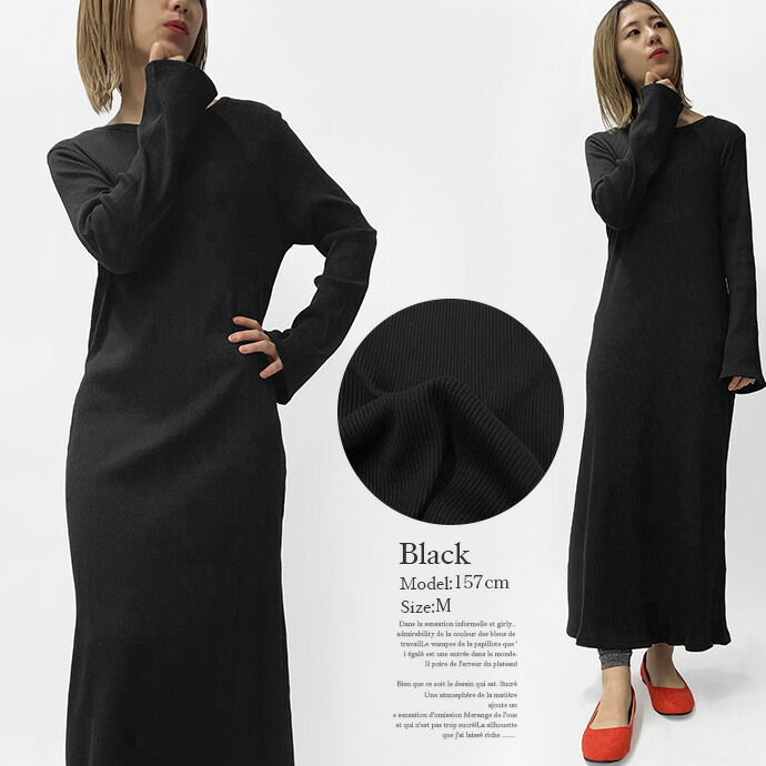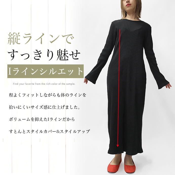 ワンピース ロングワンピース ロング丈 リブ カットソー 長袖 無地 フレアスリーブ クルーネック 綿100% コットン ストレッチ 伸縮性 通気性 洗える 春 秋 レディース