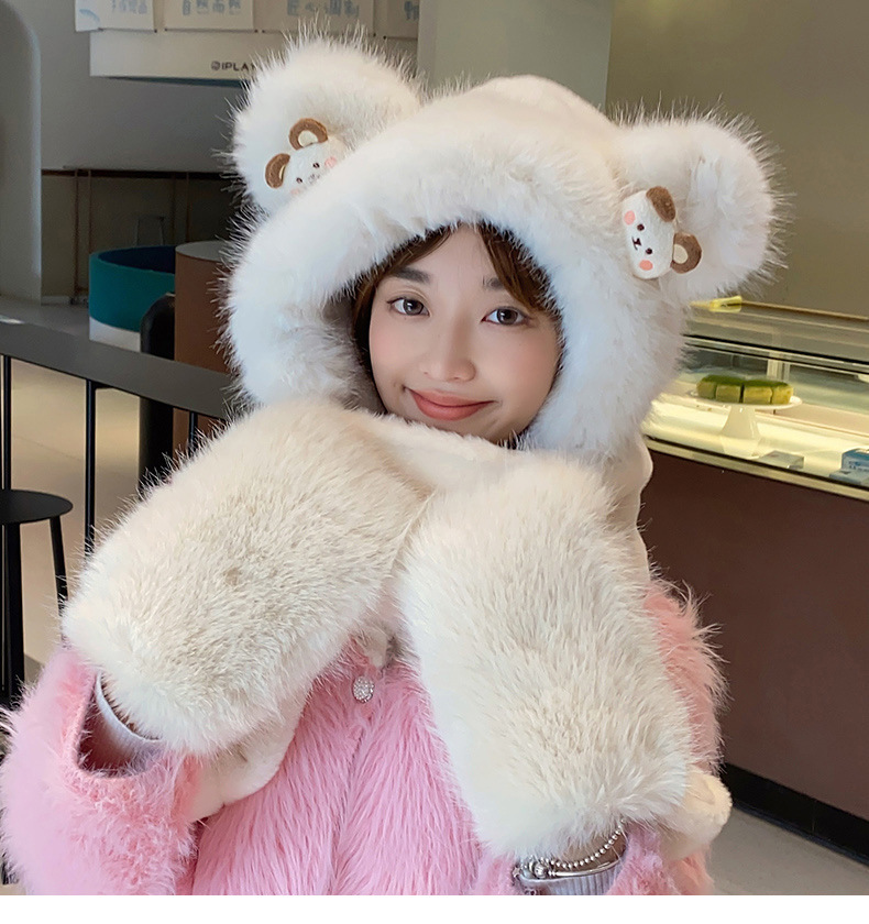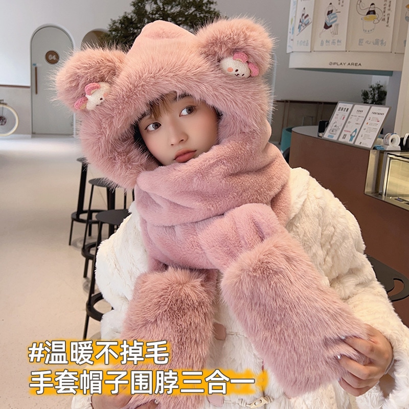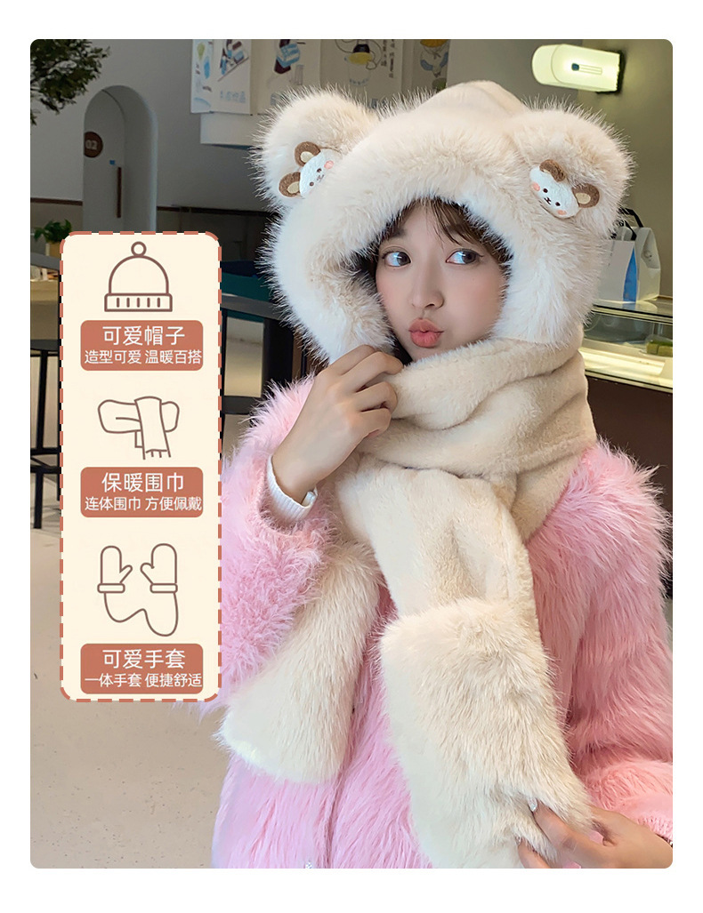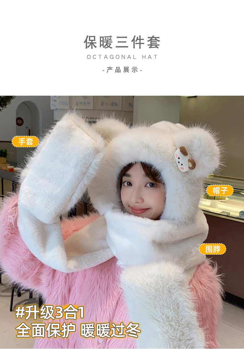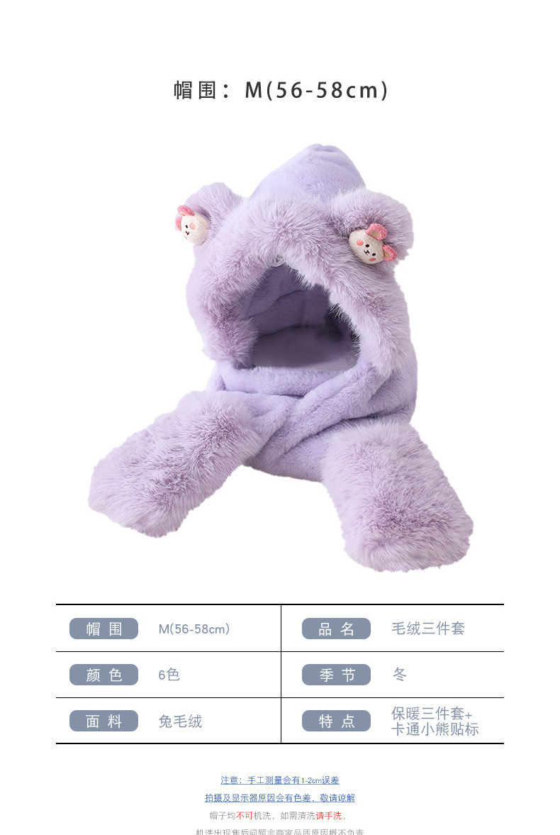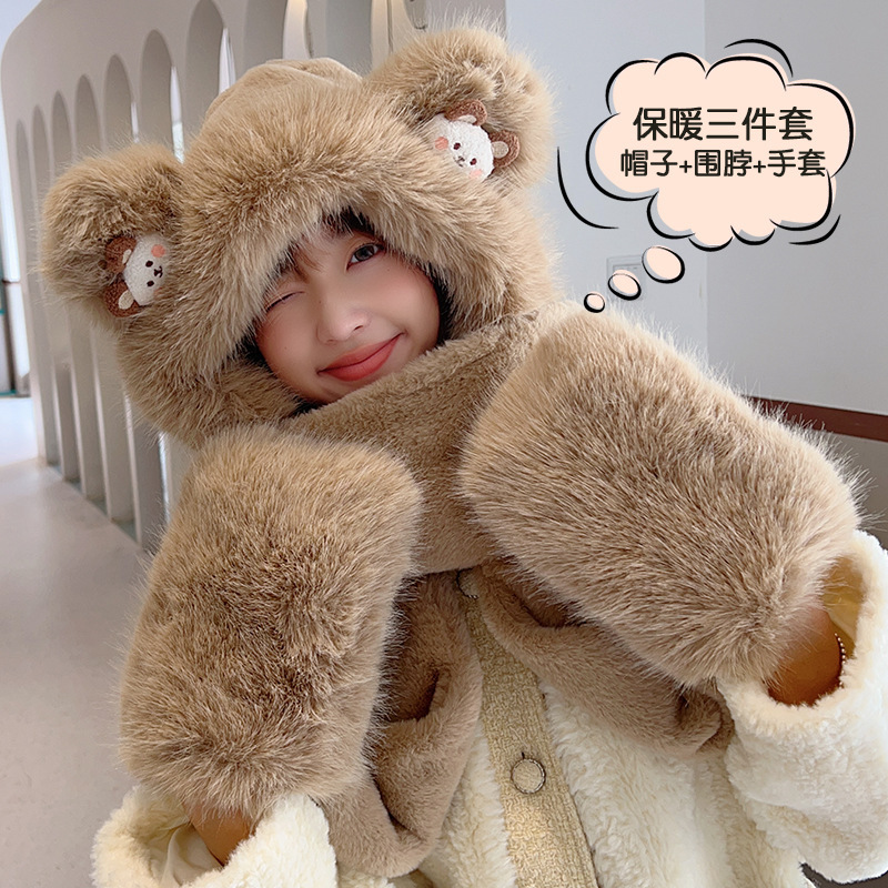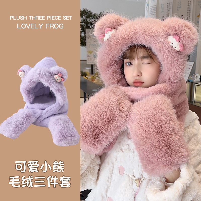 耳あて イヤーマフラー 冬の新しい漫画のクマのぬいぐるみスリーピース女性屋外防風帽子マフラー手袋ワンピース帽子 耳あて イヤーマフラー