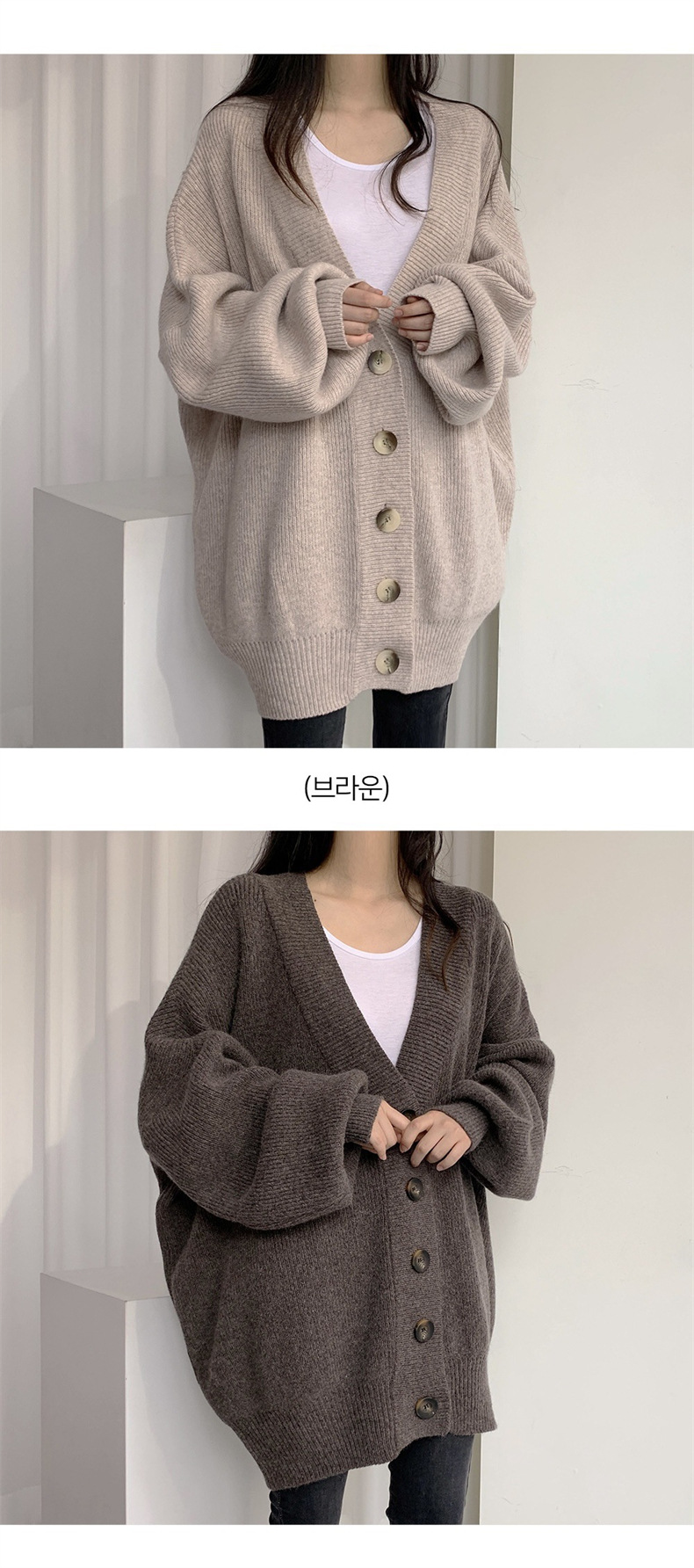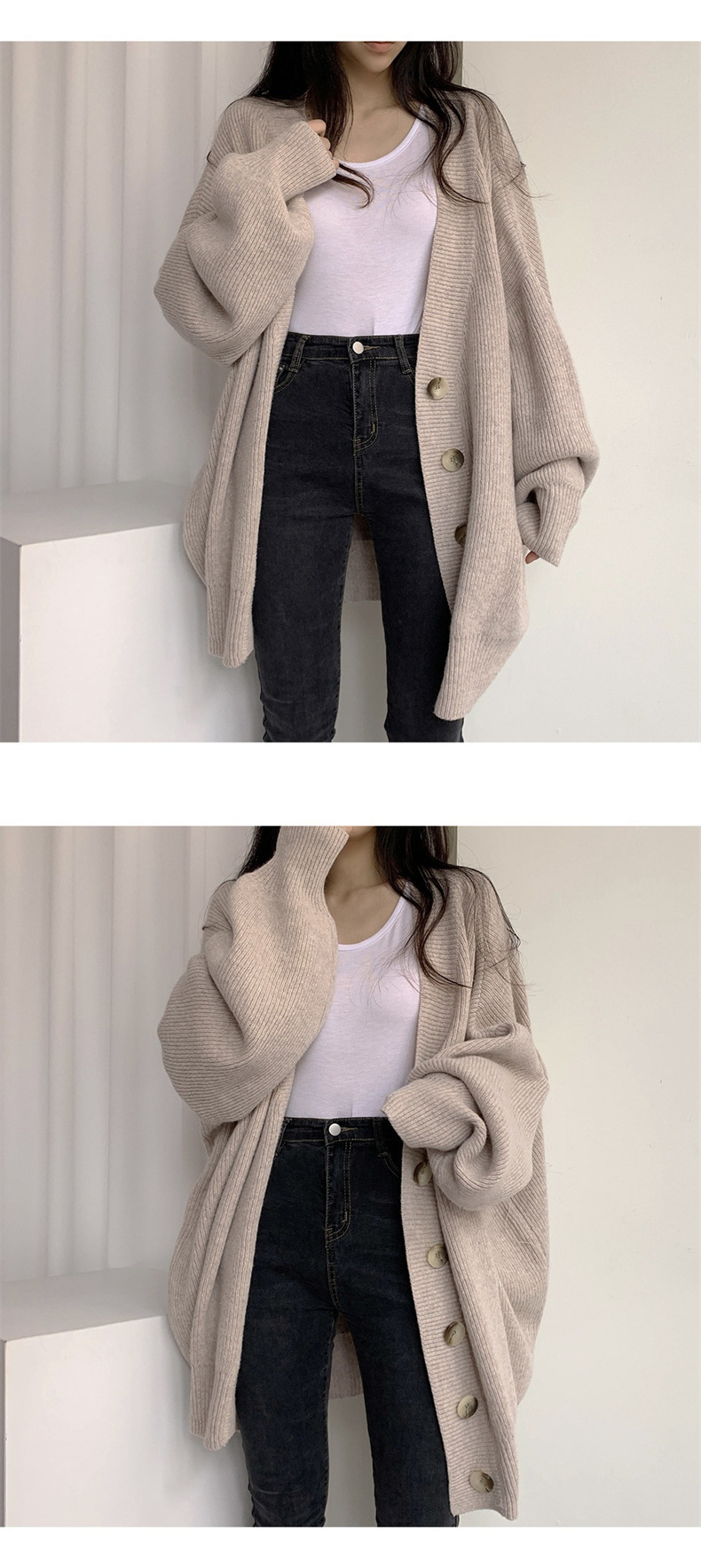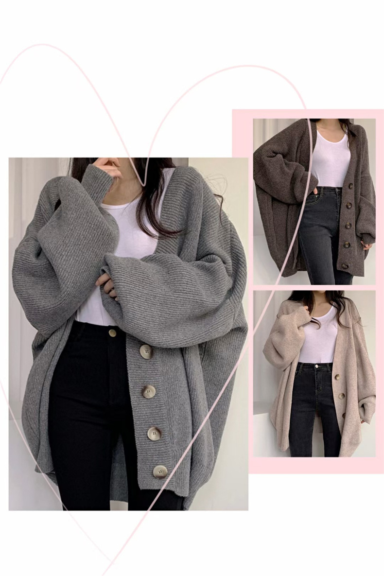 ベーシックニットニットカーディガン ミディアム丈コート秋スタイル学院だるい風Vネックゆったりパフスリーブニットカーディガン女 カーディガン