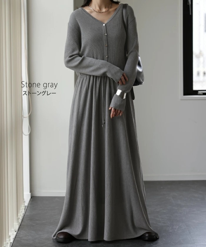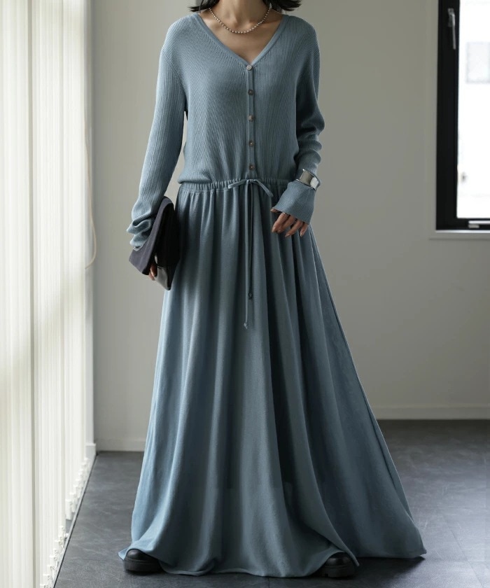 Q-CQ-07秋冬新Vネックスリム長袖ニットワンピースワンピースフェイクツーピースワンピーススタイル ニットワンピ