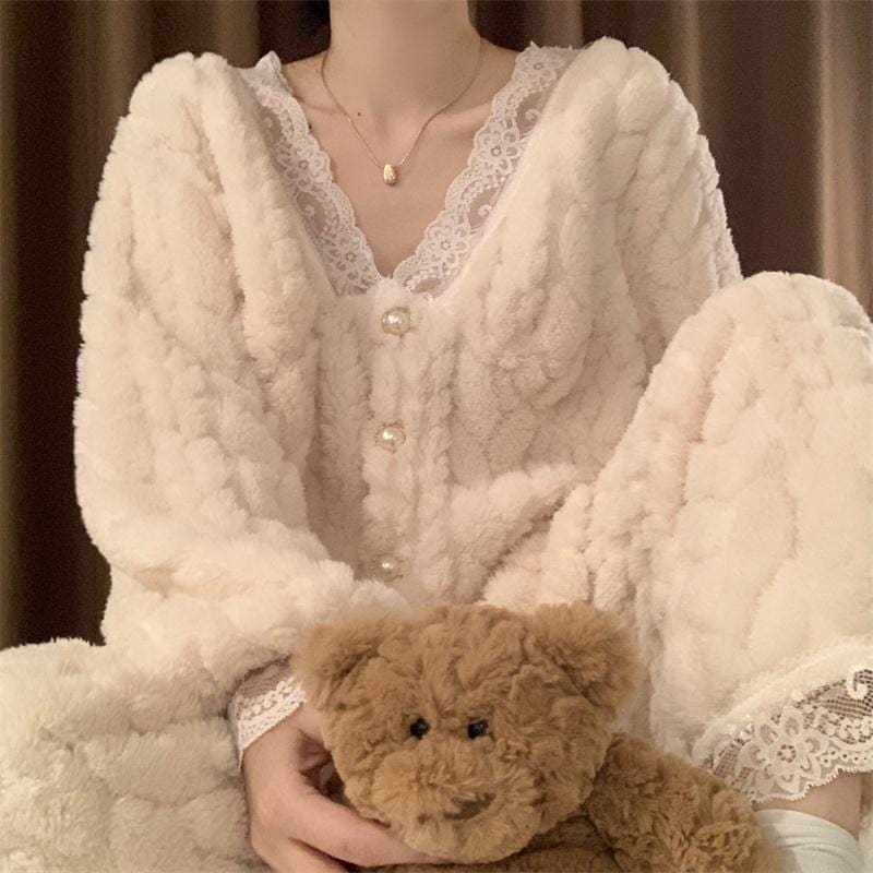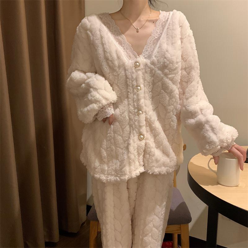 ルームウェア 新作 パジャマ冬 ルームウェア 可愛い レース パジャマ レディース フランネル 保温 ルームウェア セットアップ 韓国ファッション 部屋着