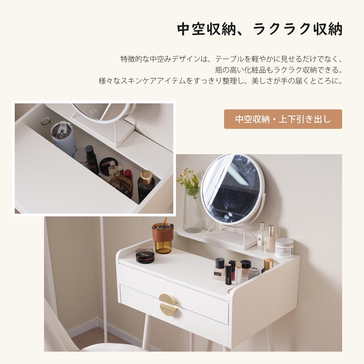 【中空収納、ラクラク収納】 特徴的な中空みデザインは、テーブルを軽やかに見せるだけでなく、瓶の高い化粧品もラクラク収納できる。様々なスキンケアアイテムをすっきり整理し、美しさが手の届くところに。