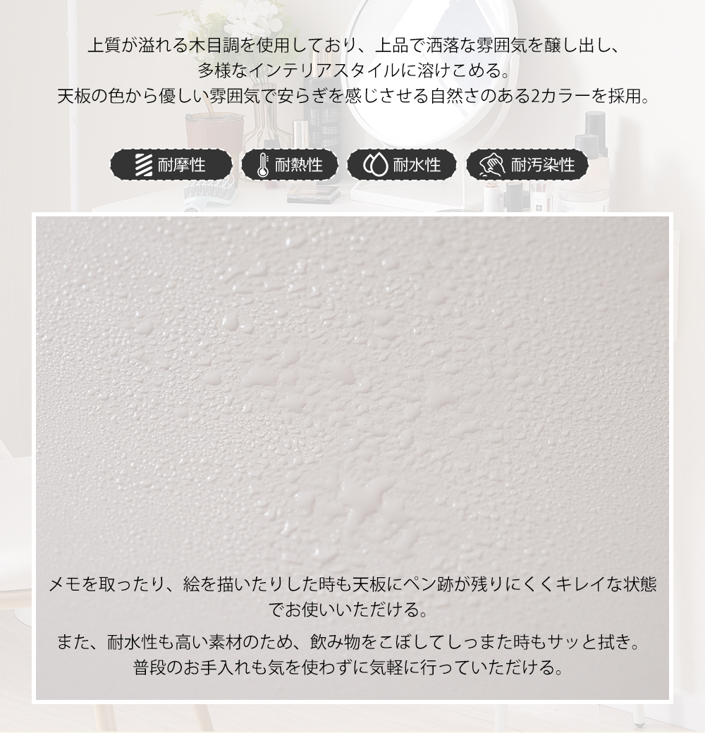【木目の立体感までを再現した美しい木目模様天板】なめらかな手触り天板は高級感といい肌触りが兼ね備える上、水や汚れに強く、耐久性も優れて、お手入れも簡単。汚れた時もサッと簡単に拭ける。