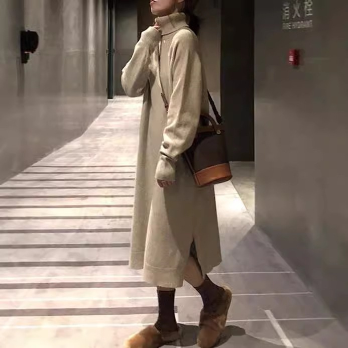 ハイネック編みの内側にコートロングセーターワンピース膝丈ボトミングと秋と冬のファッション気質 女性用ドレス ニットワンピ