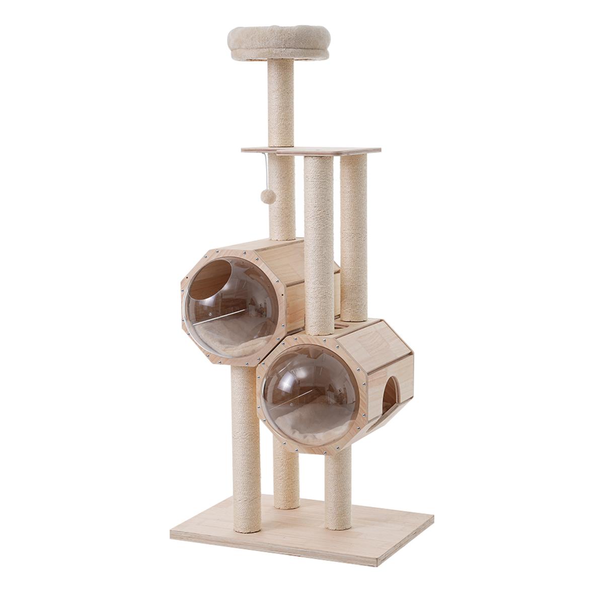 【広い二つの隠れ家】本体中心部には2つの透明な隠れ家をご用意しています。大きめなので猫ちゃんもゆったりと遊んだり寝転んだりできます。エアフルーデザインが増設し、通気性を確保!