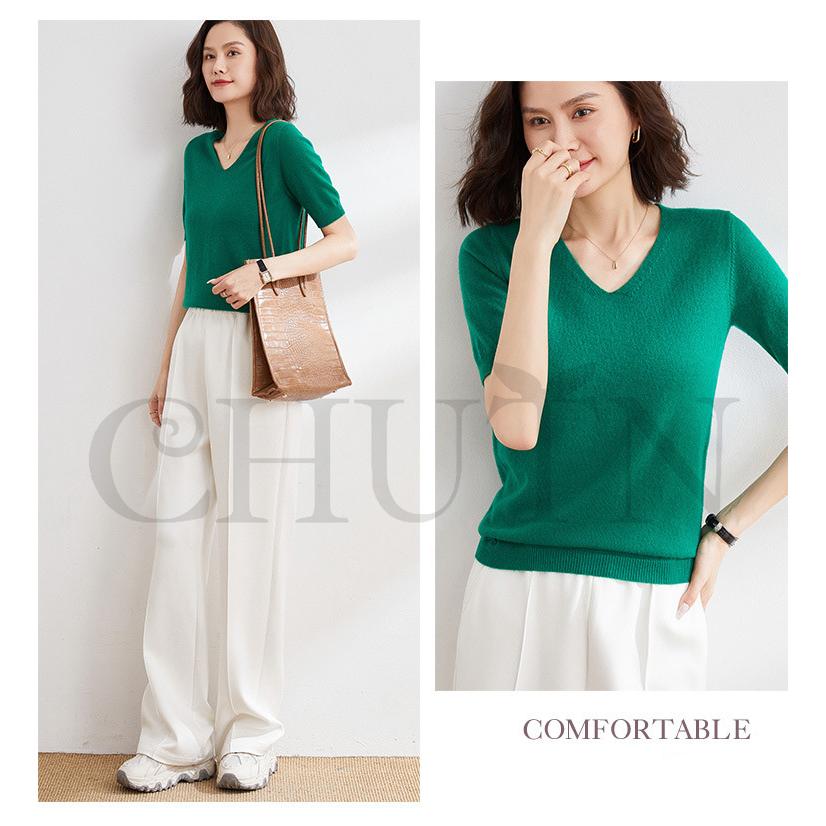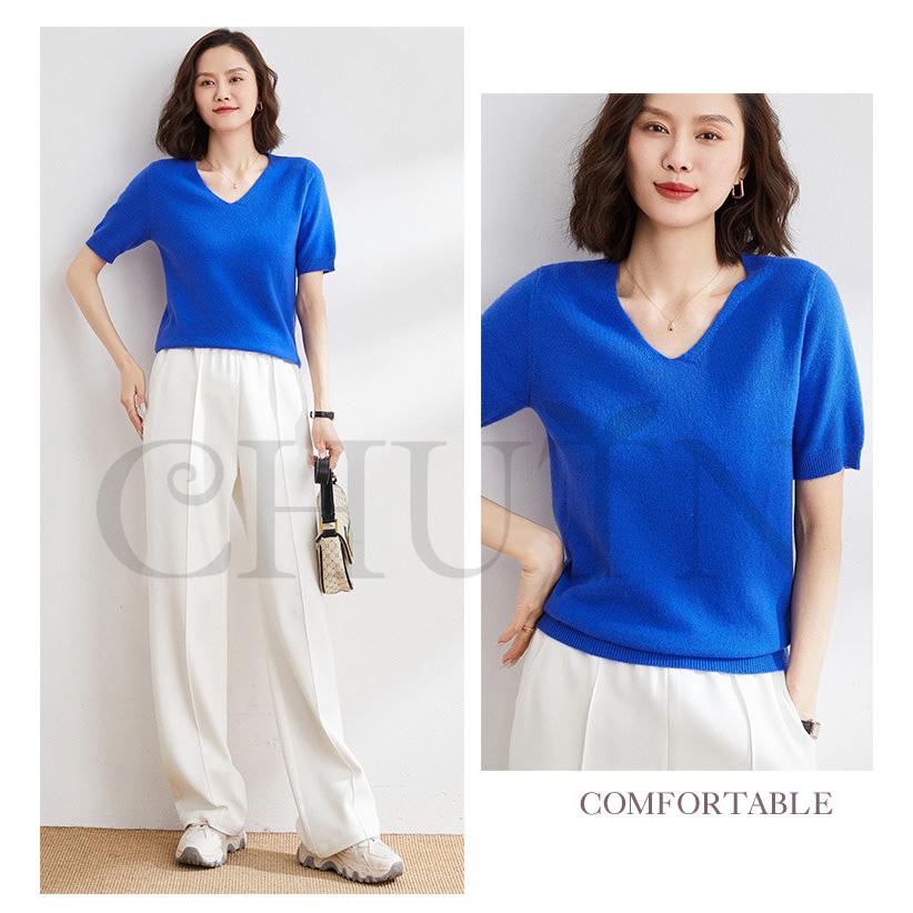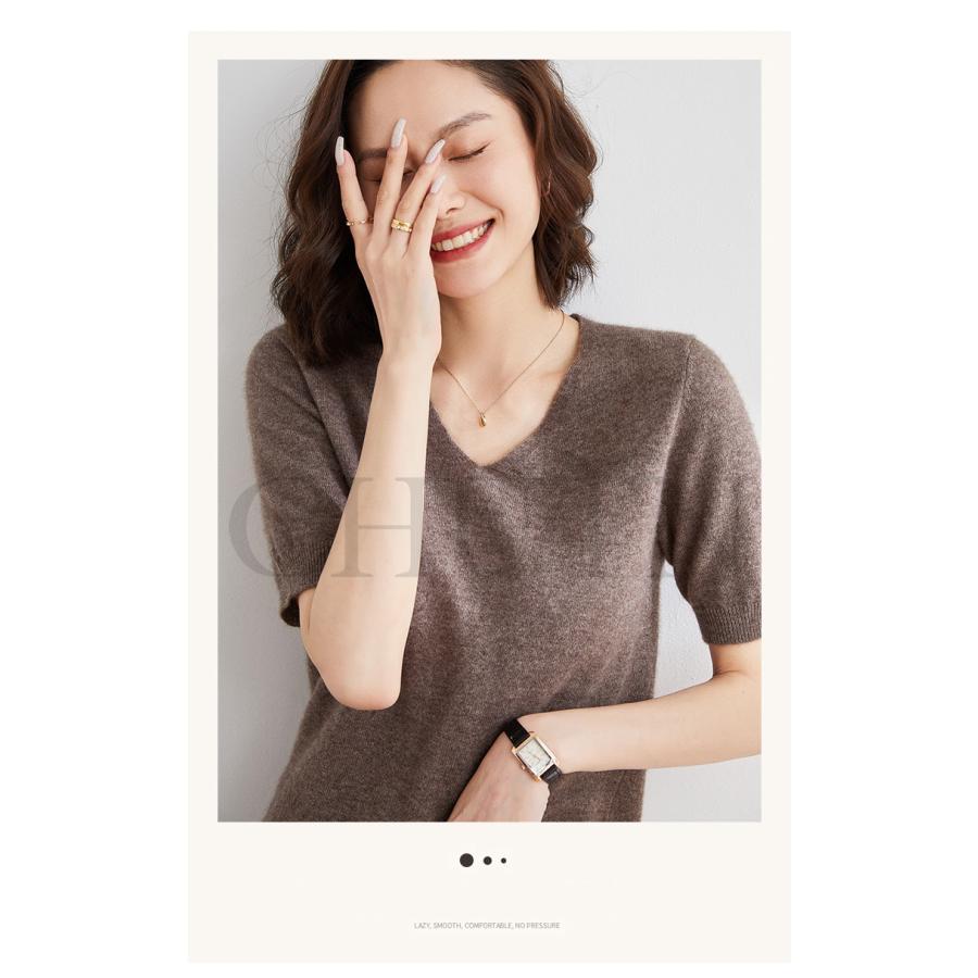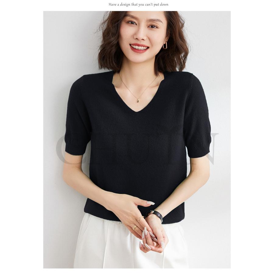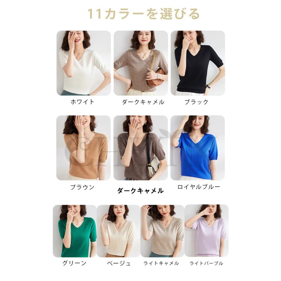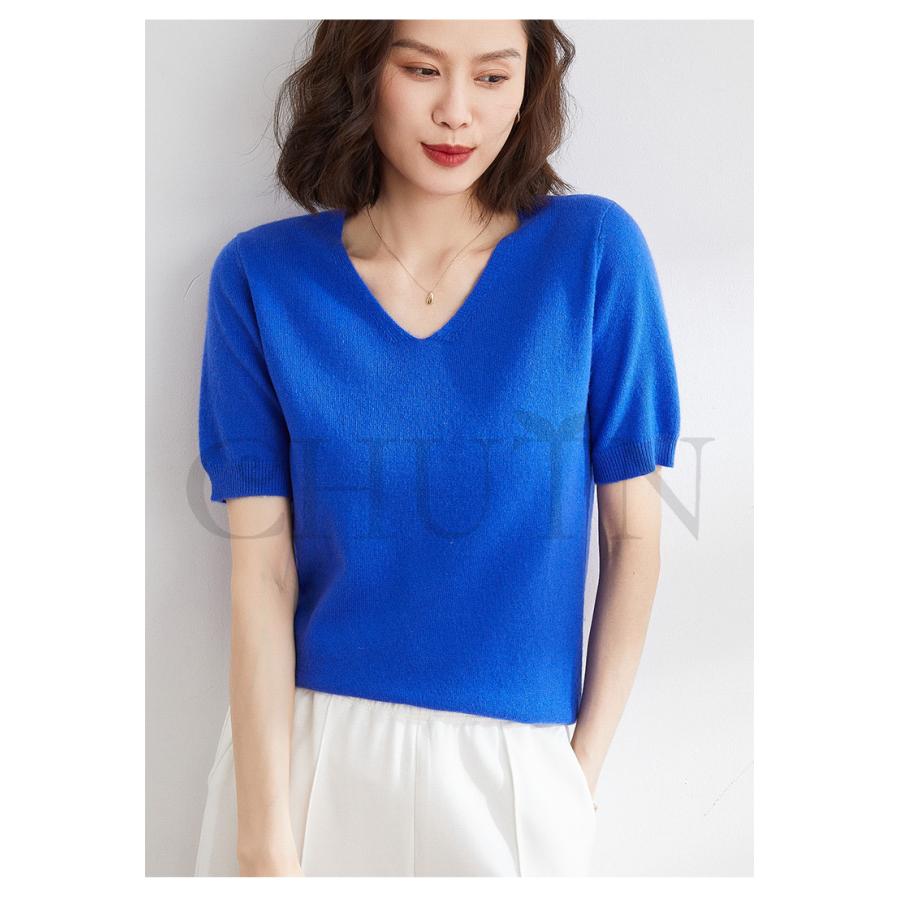 サマーニット セーター レディース vネック 五分袖ニットトップス プルオーバー ゆったり 着痩せtシャツ 韓国風通勤大人30代40代ロイヤルブルー夏秋