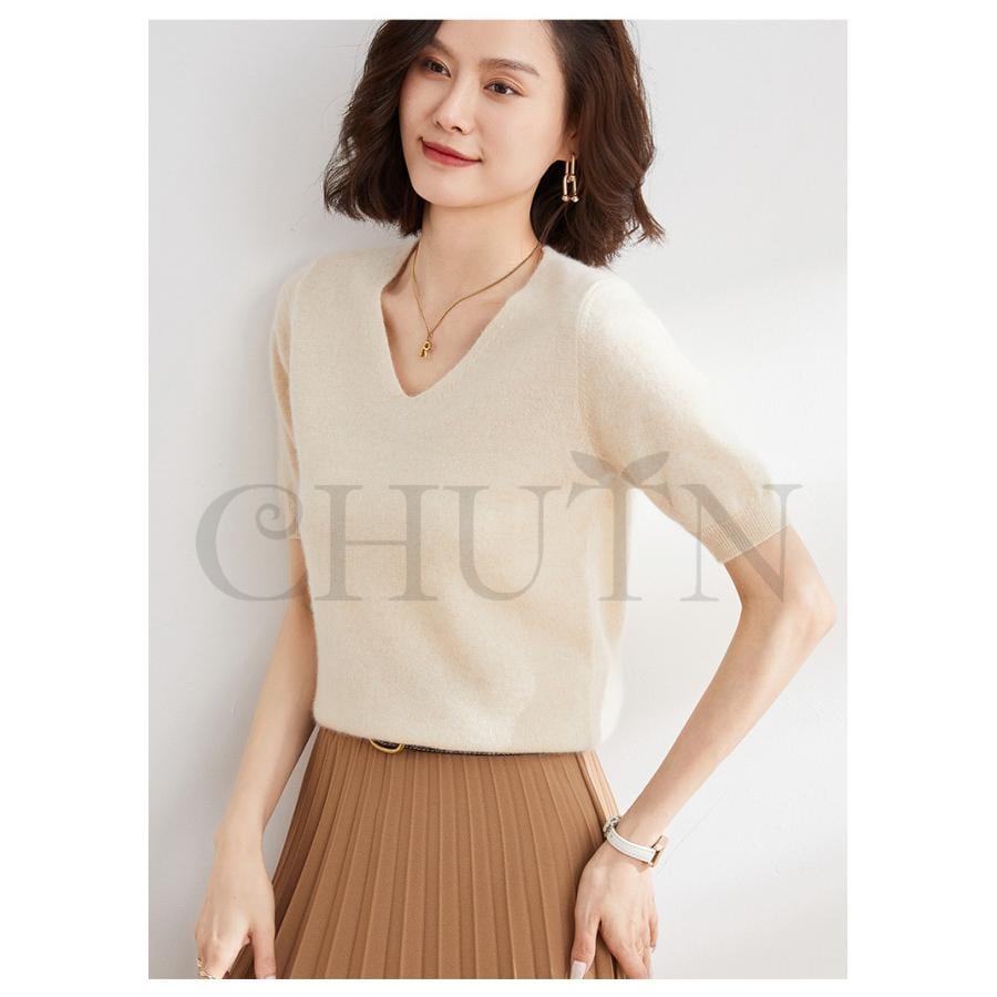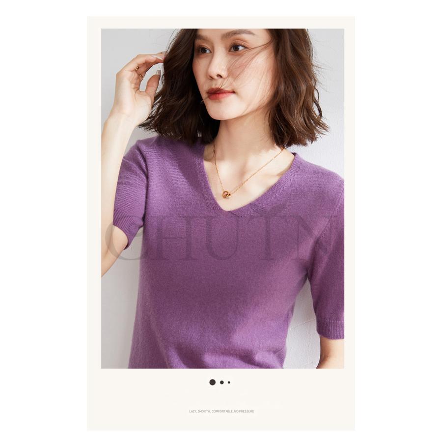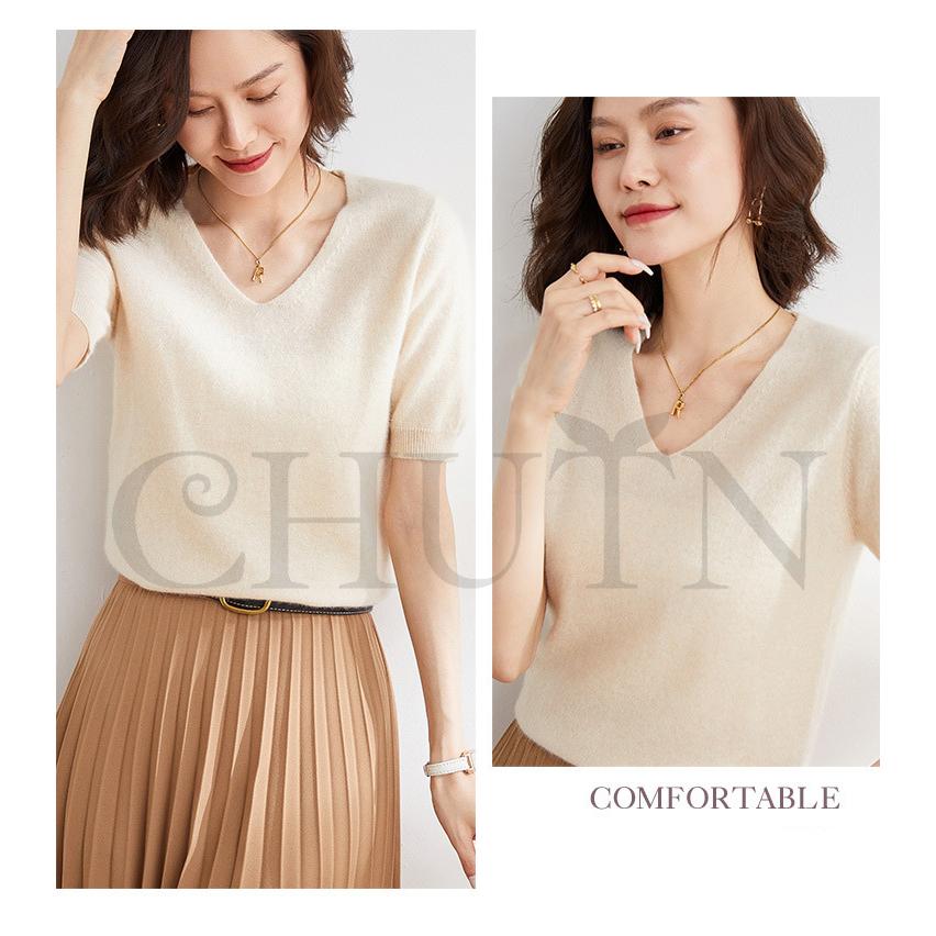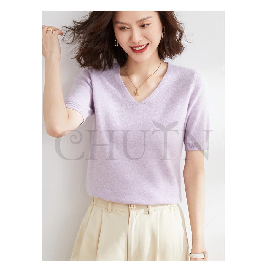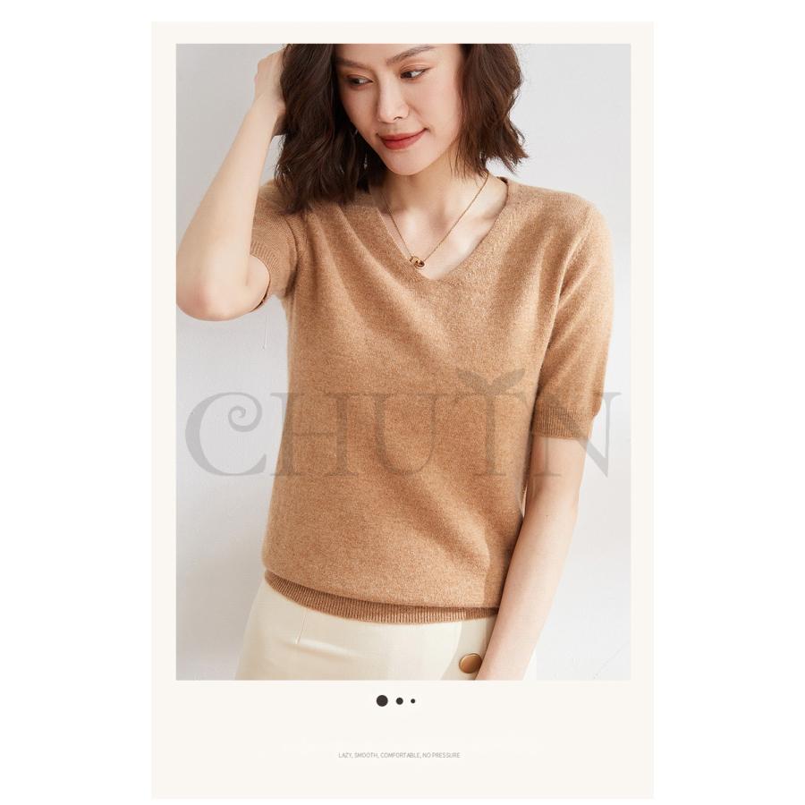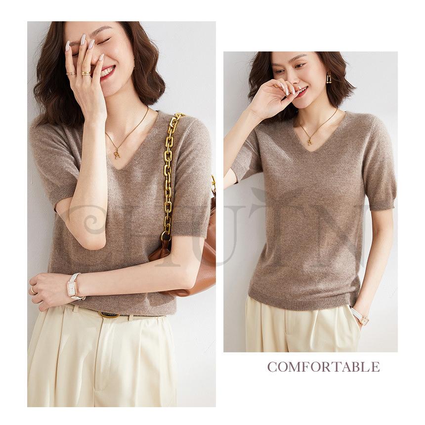 サマーニット セーター レディース vネック 五分袖ニットトップス プルオーバー ゆったり 着痩せtシャツ 韓国風通勤大人30代40代ロイヤルブルー夏秋