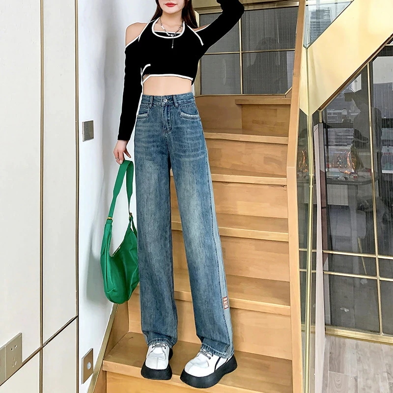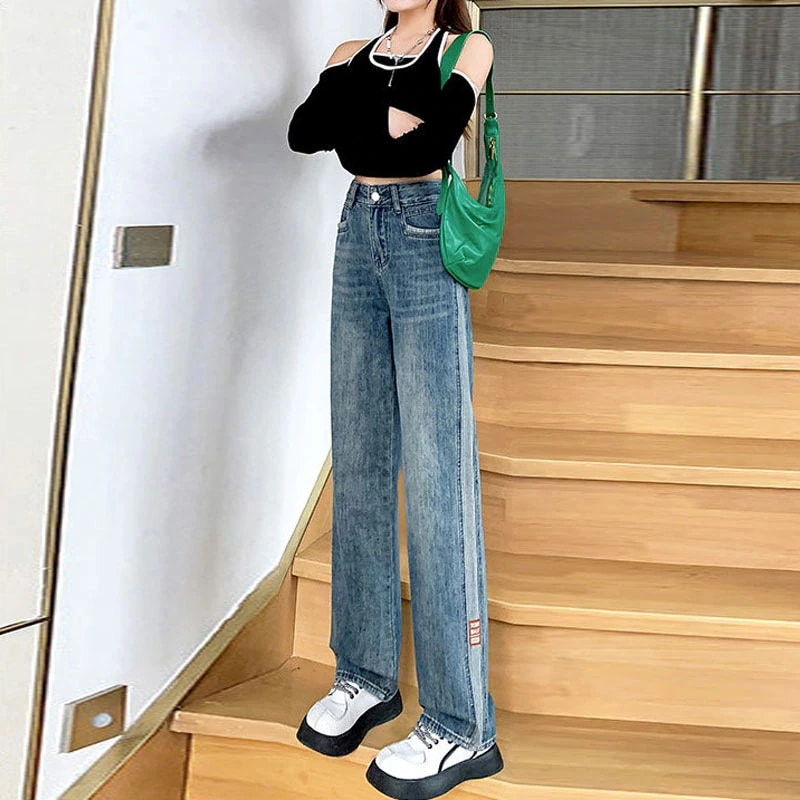 韓国 ワイドパンツ レディース 夏 ハイウェスト ストレートパンツ 着痩せ モ ップパンツ デニム ジーンズ