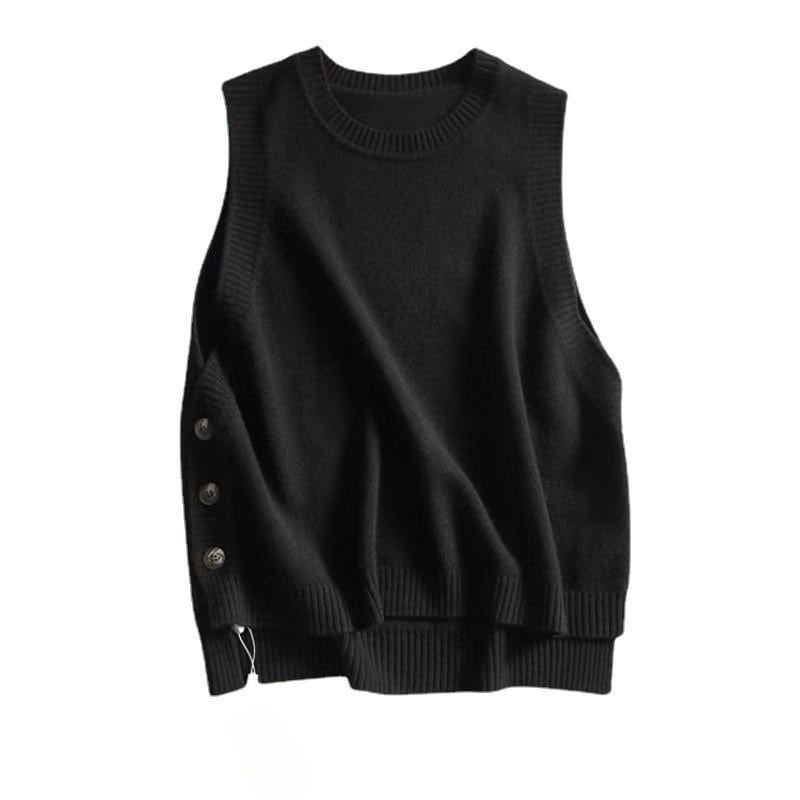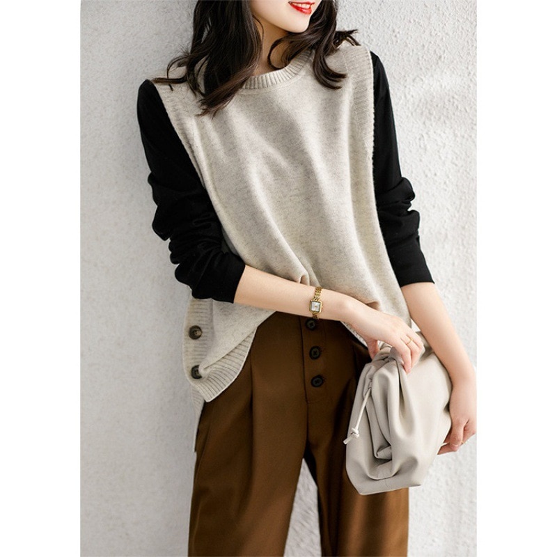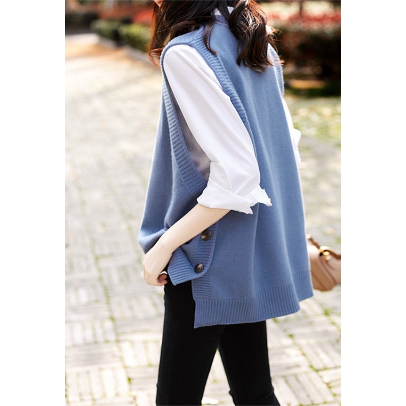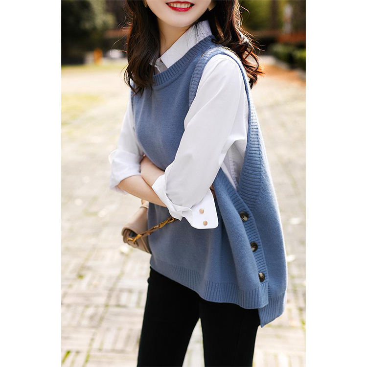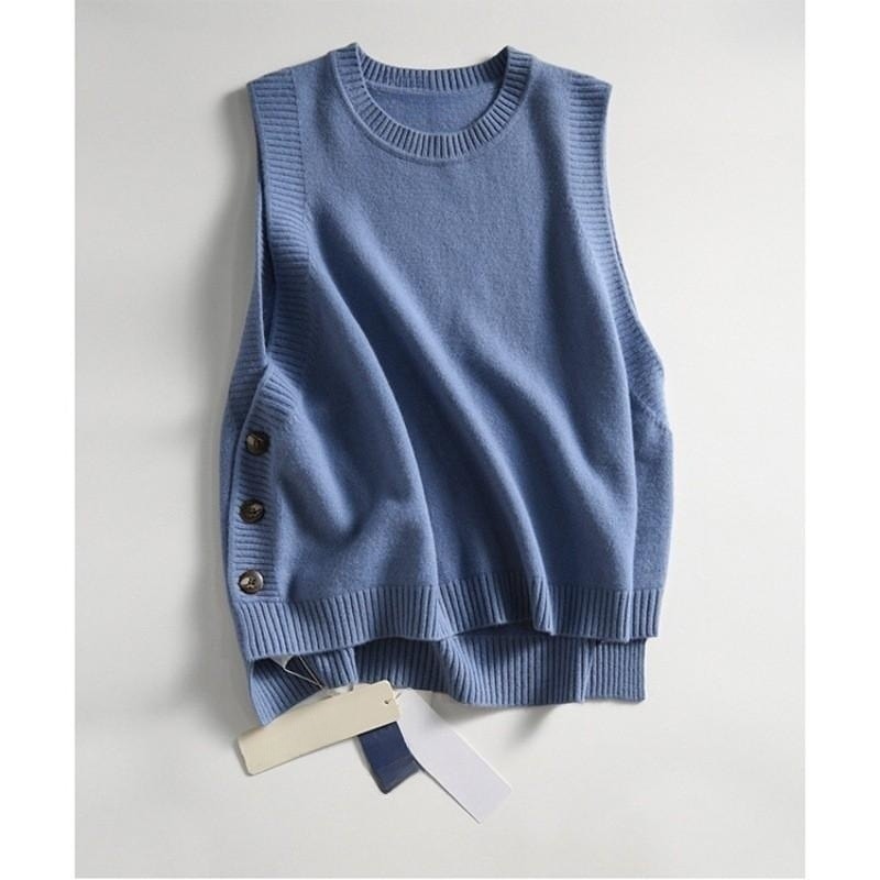 秋の新しいヘイズブルーニットウエストコート女性の気質の老化ジャケットラウンドネック文学的なセンスのベストカジュアルな女性の服 ベスト