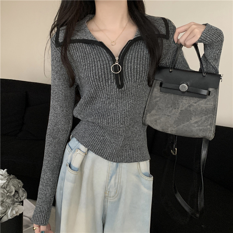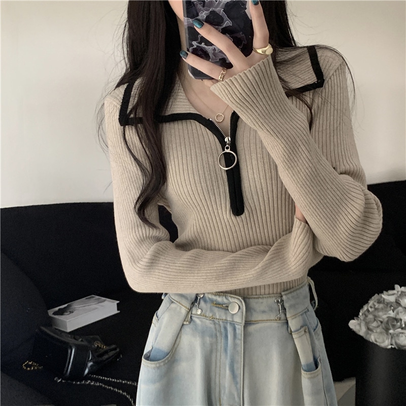 色の衝突ハーフジップラペルジャンパー女性春と秋の底スリム薄いニットセータートップス ニット セーター