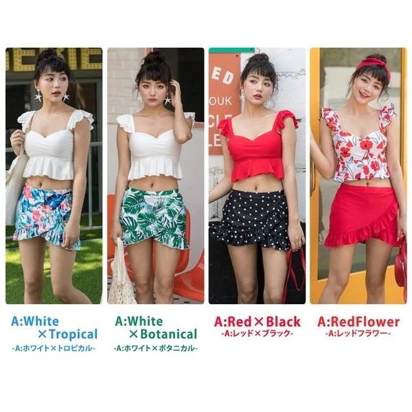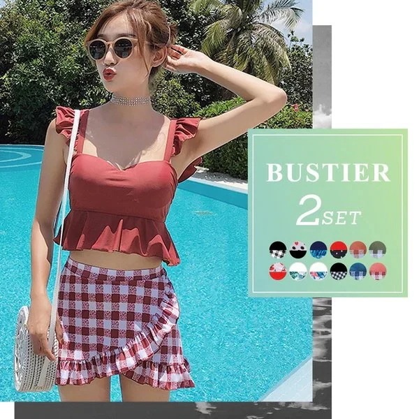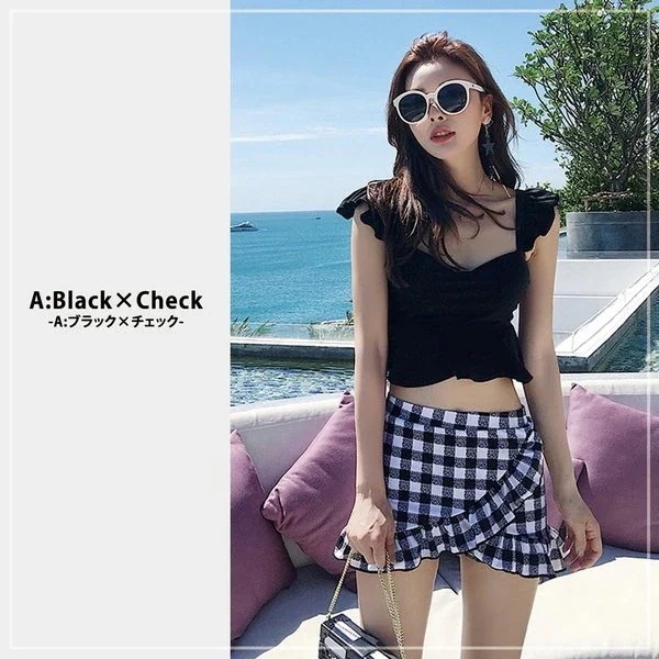 水着 レディース ビキニ ビスチェ風 ハイウエスト 2点セット 人気 ギンガムチェック柄 フレア フ ビキニ