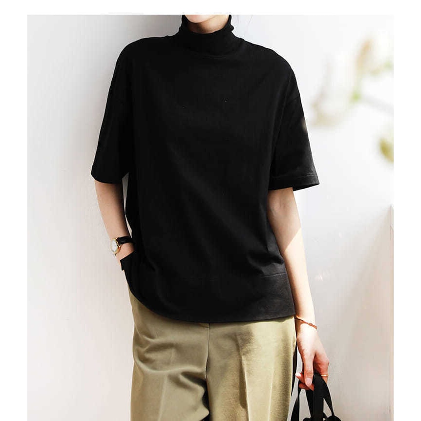 ハイネック Tシャツ しい レディース 春 夏 半袖トップス カットソー ストレッチ ボトルネック ゆったり 無地 uvカット サイド スリット おしゃれ 綿 夏服