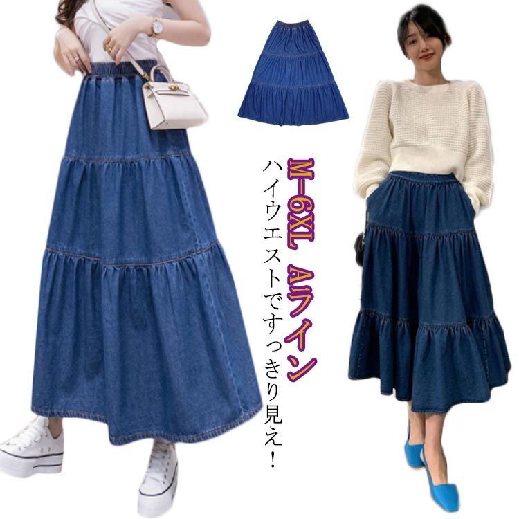 マキシ丈スカートフレアスカートミモレ丈ゆったりウエストゴムティアード体型カバーハイウエストAラインボトムスロングデニムスカートデニムスカート夏柔らか大きいサイズカジュアル