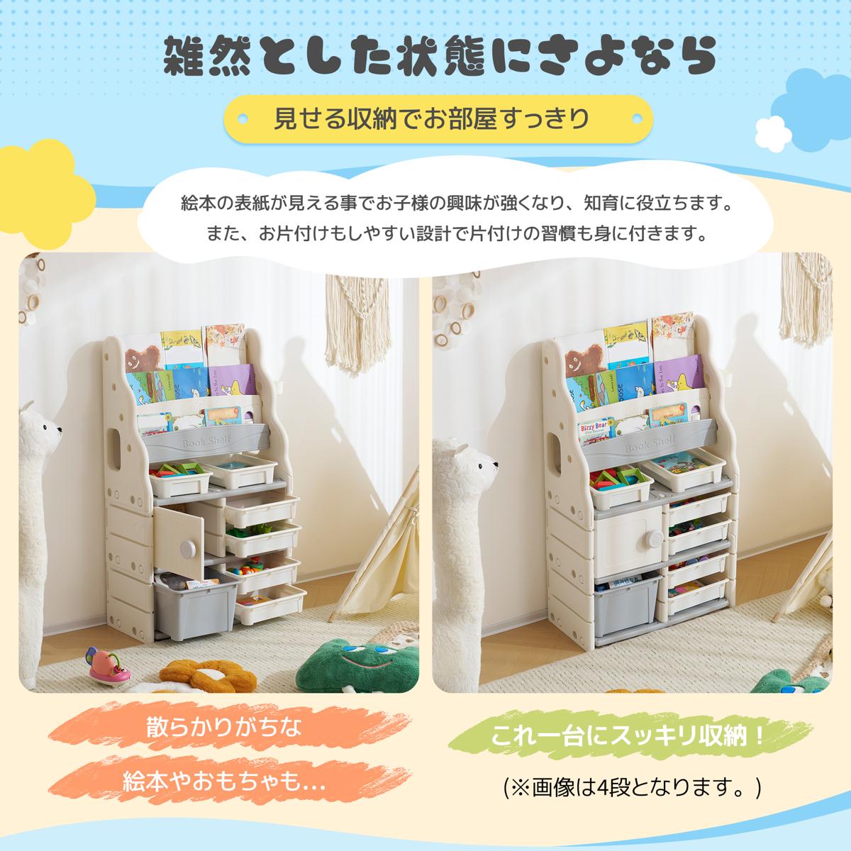 絵本ラック 絵本棚 大容量 本棚 収納ラック 多機能 おもちゃ収納 収納ボックス 子供部屋 収納ケース 子ども用 家具 HDPE キッズ White+gray HDPE