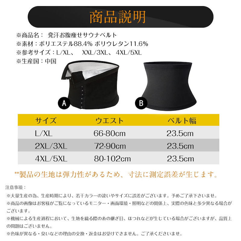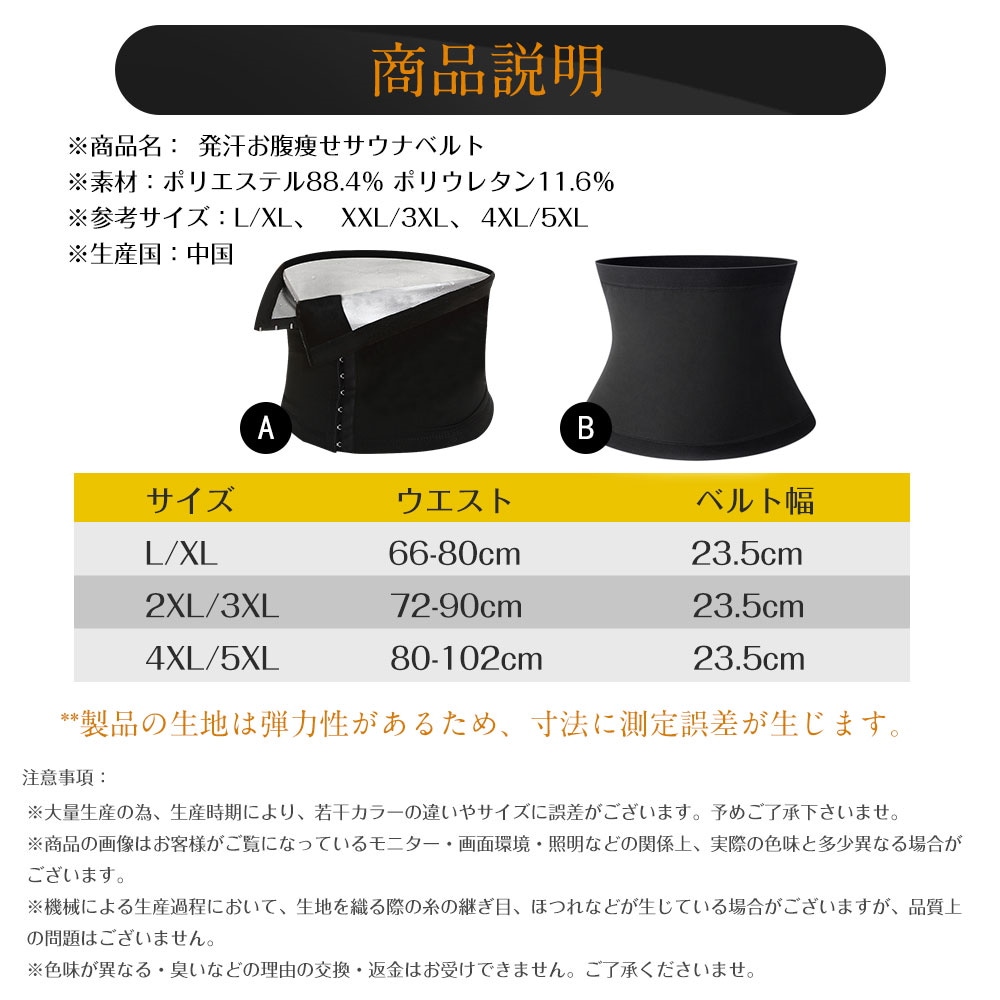 商品名: 発汗ベルト ※素材:ポリエステル88.4% ポリウレタン11.6% ※タイプ:腹巻式 ベルト式 ※参考サイズ:L/XL、 XXL/3XL、 4XL/5XL ※生産国:中国 商品詳細 ●温度を逃さない特殊素材を内側に使っており、体から発する熱を逃さず、高い密閉性、高い保温力で発汗力UP! ●ダイエット向けに大人気!薄くて目立たないので家事でもお買い物でもジムでもスポーツでも、巻くだけでお腹周りの発汗をサポートします。 ●優れた伸縮性、柔軟性、耐久性で動きやすく、お腹のお肉を引き締め、着やせ効果抜群で減量効果を期待できます!!運動時も日常生活も使用可能! ●お腹痩せダイエットべドルは血行と発汗を促進し、燃焼をサポート!素材も銀ナノコーティングにより抗菌、抗臭機能も備えた生地なので、汗の嫌な臭いをおさえ快適にお使い頂けます。 ●お手入れ門簡単、ベルトは保温性に優れているので、ダイエットだけではなく、冷え性のかたの腹巻きとしてもおすすめです。