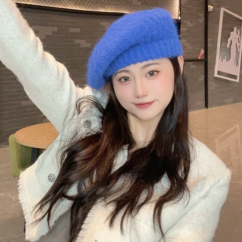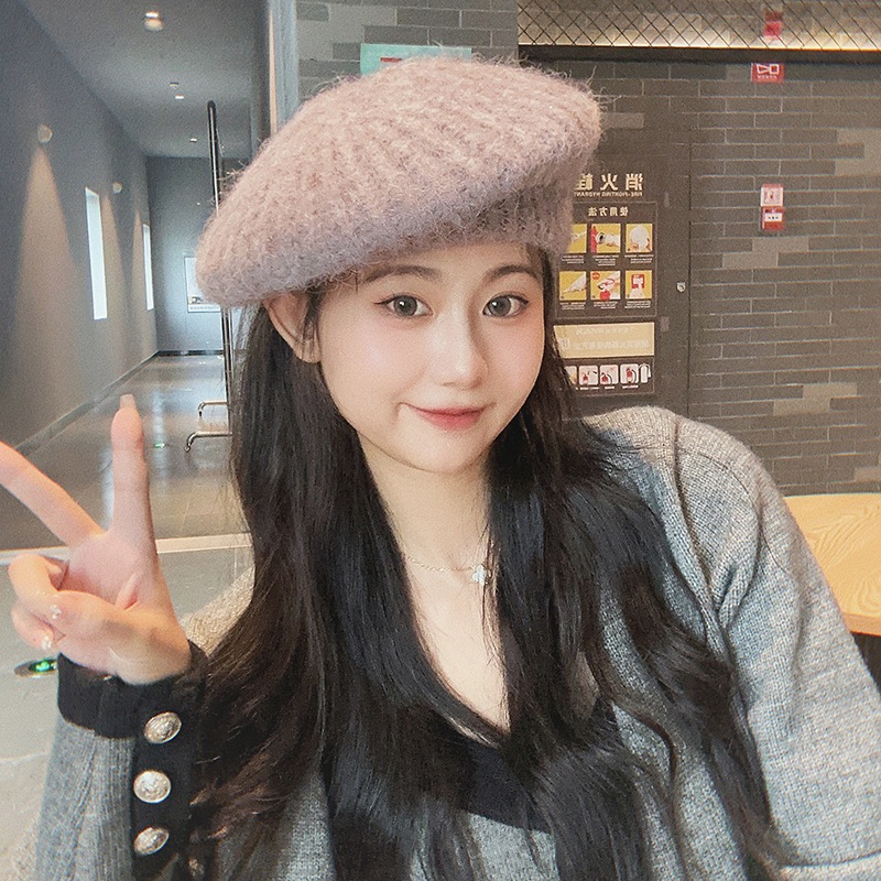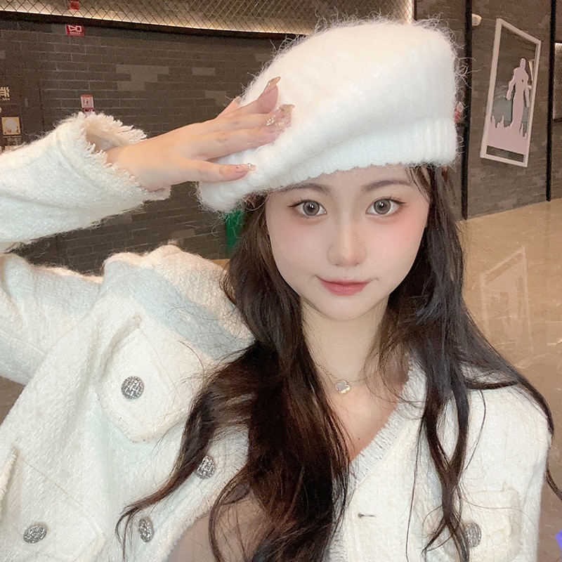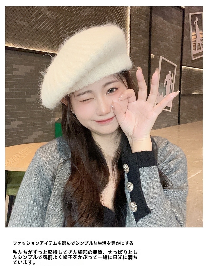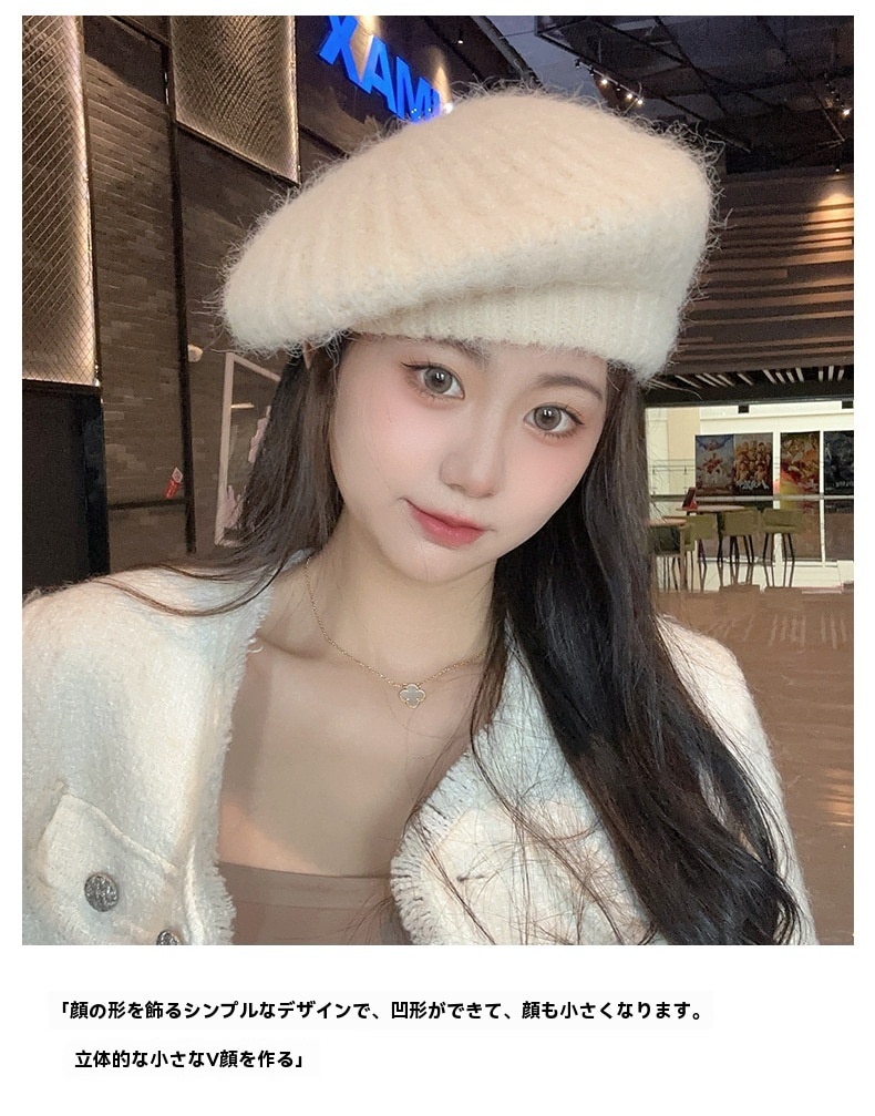 新しいベレー帽白い帽子女性冬暖かいショー顔小さな画家帽子大きな頭周りニット帽百 ニット帽
