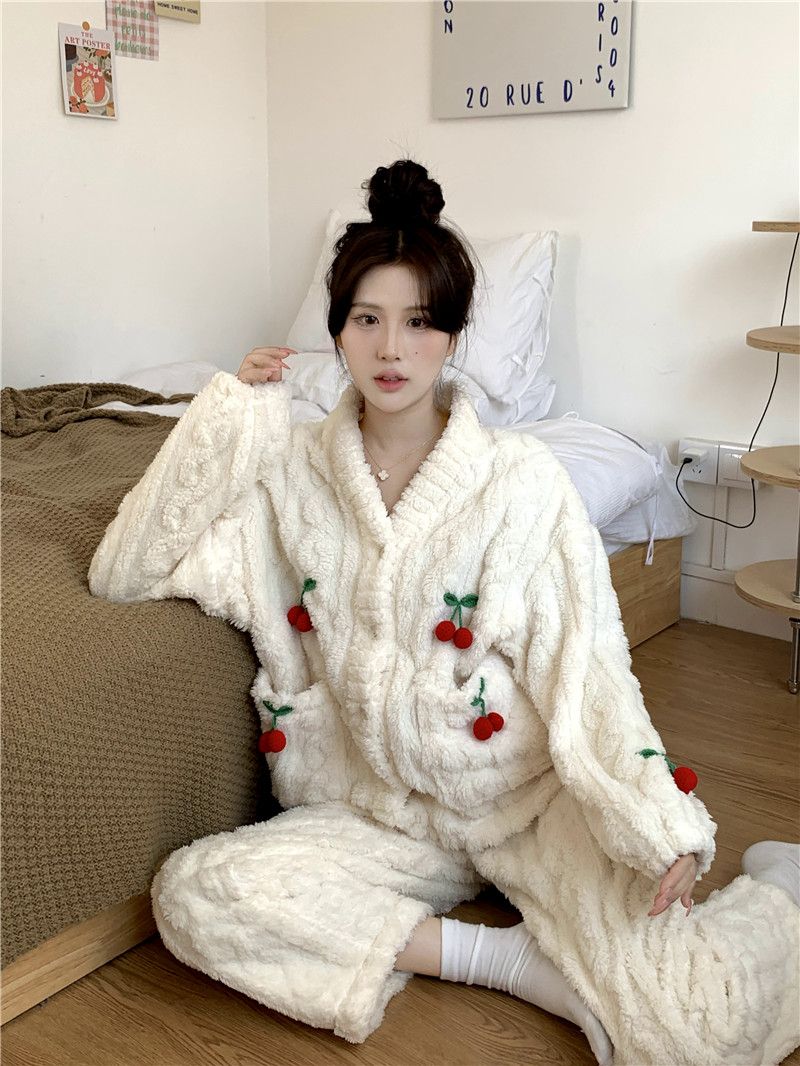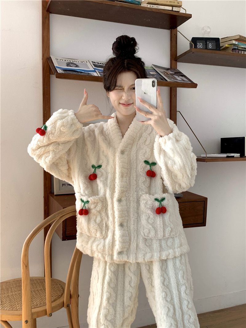 甘いさくらんぼ長袖サンゴベルベットパジャマ女性カーディガン少女小香風ベルベット厚い保温家庭服冬メガ割 メガ割 秋冬 裏起毛 ルームウェア 上下セット 長袖