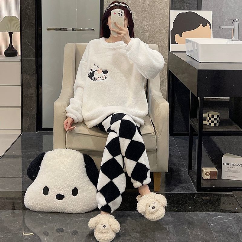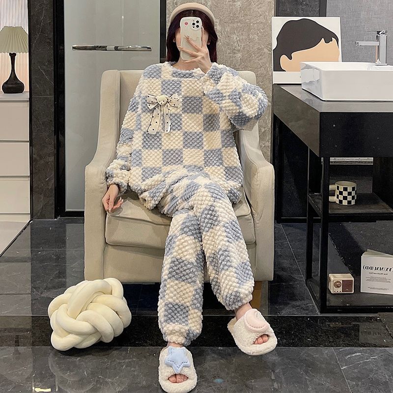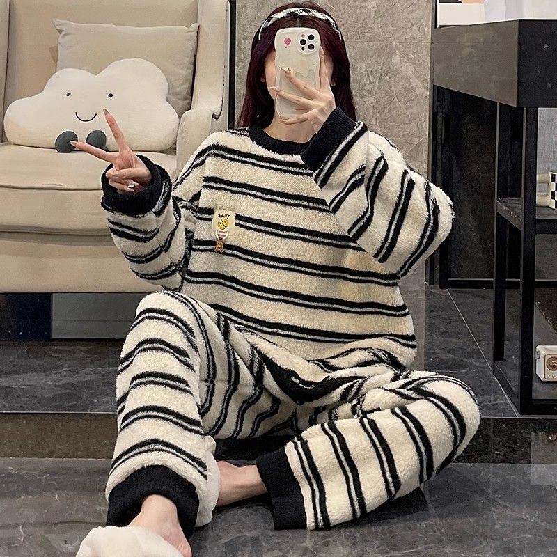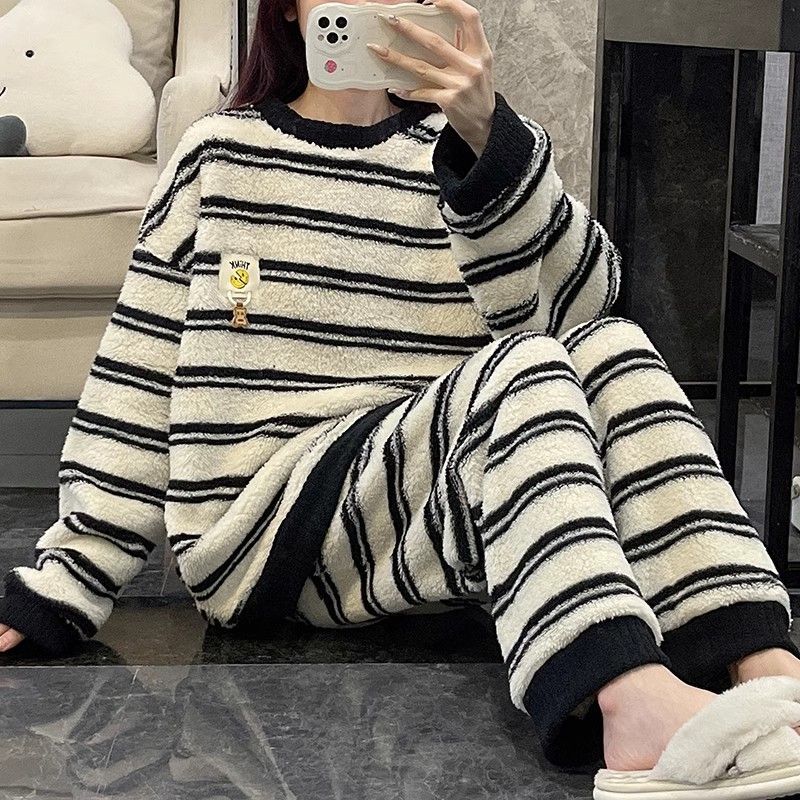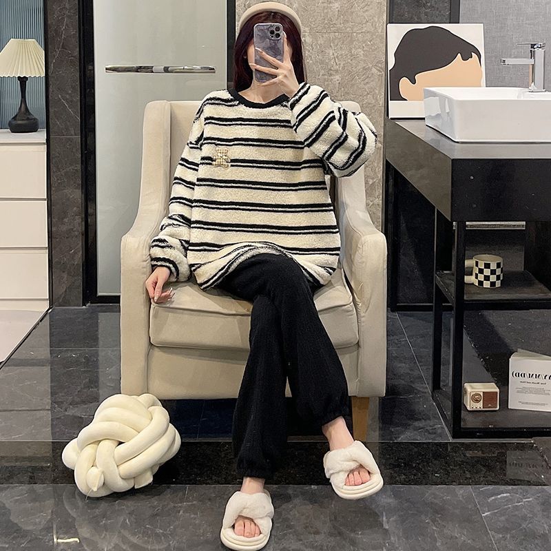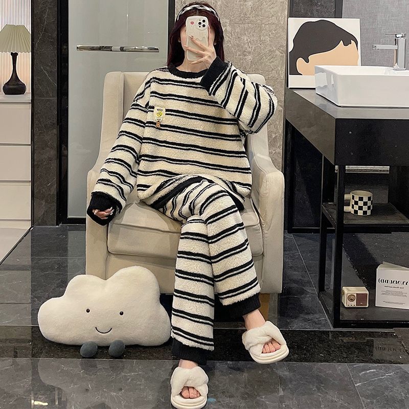 サンゴのパジャマ女性冬の新型ストライプ韓国系シンプルins風秋冬モデルは家庭服セットを着ることができるメガ割 メガ割 秋冬 裏起毛 ルームウェア 上下セット 長袖
