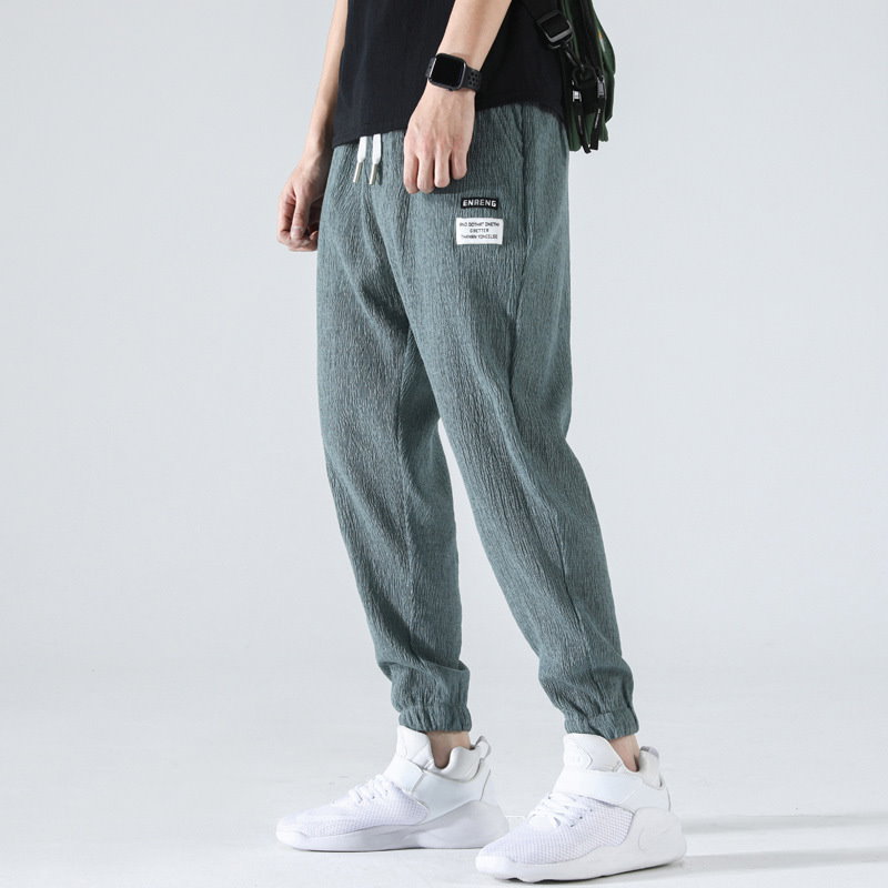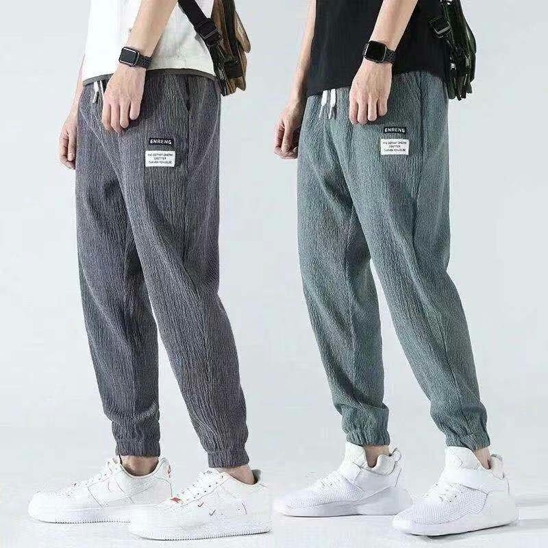 ゆったり冷感無地パンツメンズ夏薄手アイスシルクウエストパンツカジュアルロングパンツスポーツ九分パンツ